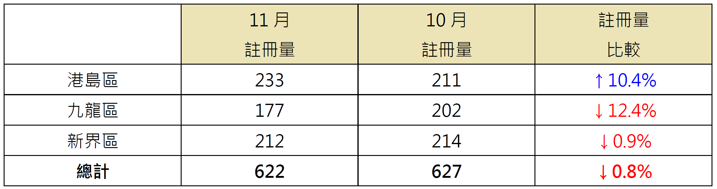 据土地注册处资料显示,11月二手住宅录3,812宗二手住宅注册,较10月的3,656宗增加约4.3%;当中逾1,000万元二手住宅录622宗注册,较10月的627宗(见图)微跌约0.8%,表现较整体二手市况稍为逊色。鉴于签署买卖合约至递交到土地注册处注册登记需时,11月注册个案一般主要反映10月市况。