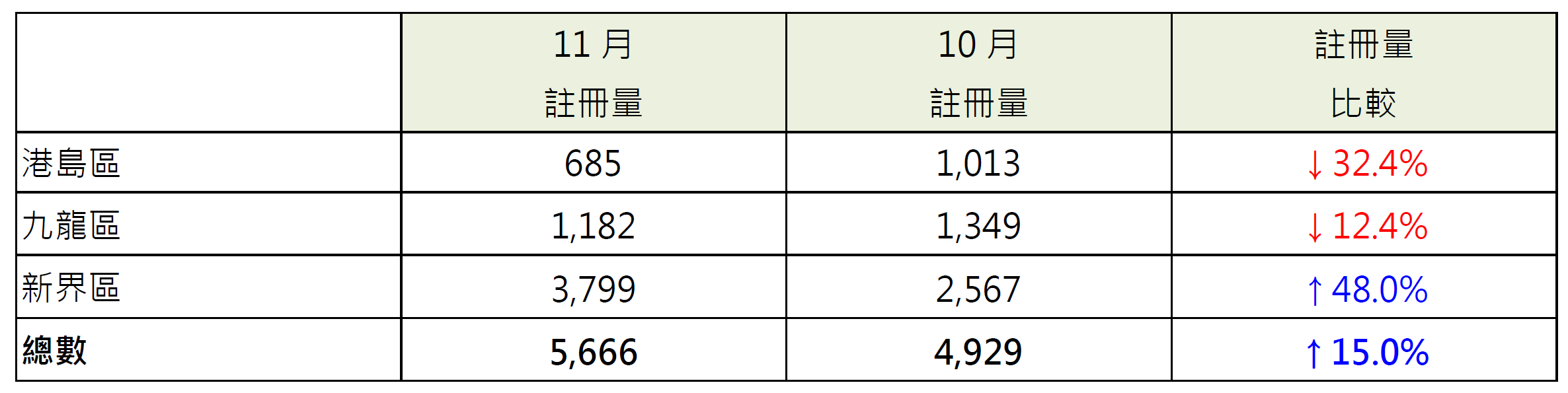 若以港岛、九龙及新界三区划分11月住宅物业注册量表现,当中新界区录3,799宗注册,较10月的2,567宗增加约48%;反观,九龙区录1,182宗注册,较10月的1,349宗减少约12.4%;港岛区录685宗注册,较10月的1,013宗减少约32.4%(见表)。