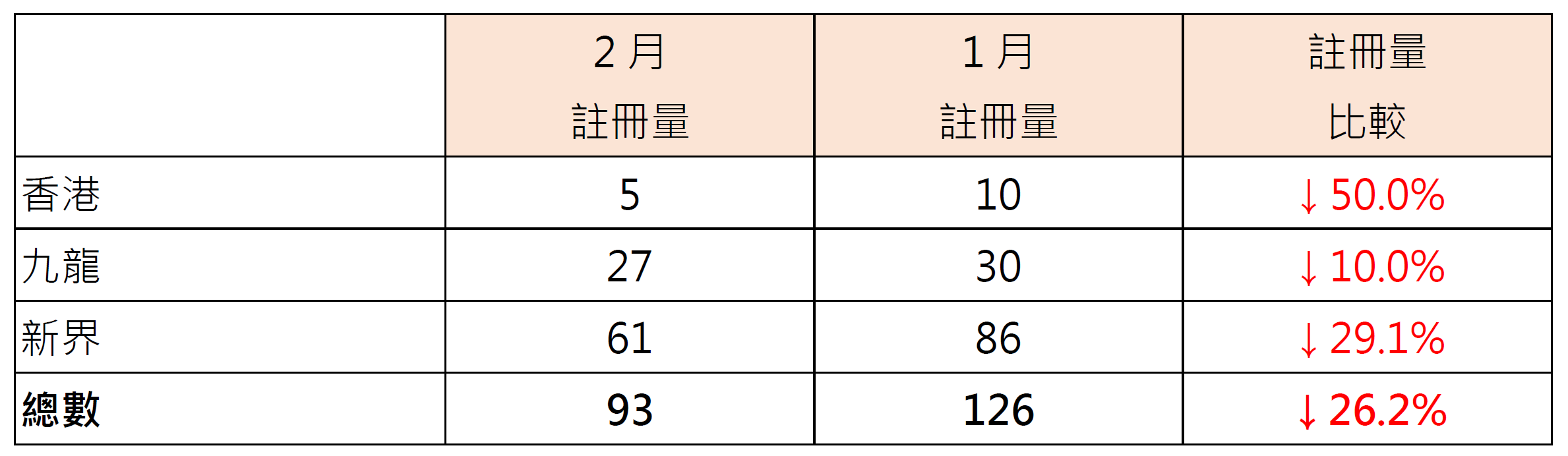 鉴于签署买卖合约至递交到土地注册处注册登记需时,每月注册个案一般主要反映前一个月市况