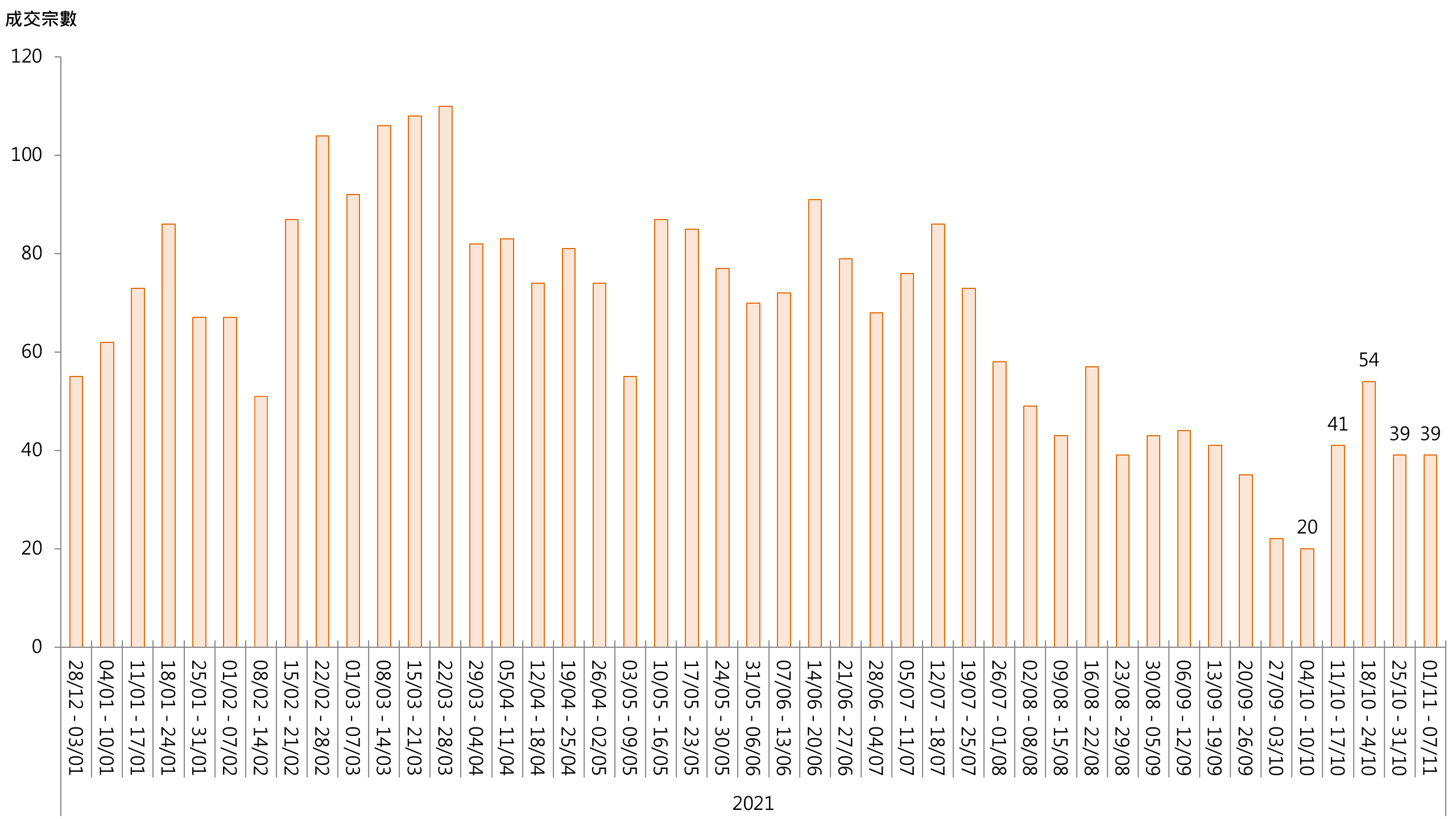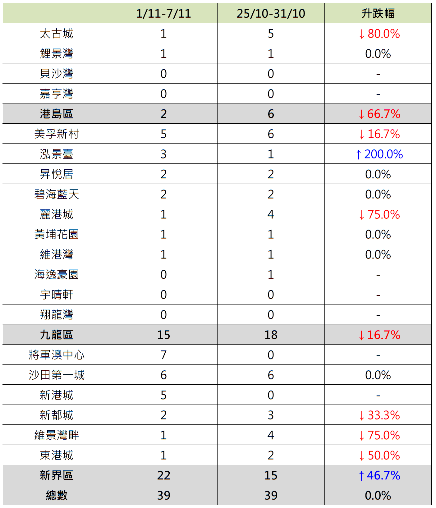 据本行前线分行所录得的数字显示,综合过去一星期(11月1日至11月7日)全港20大主要屋苑二手买卖录39宗成交,按周持平(见图)。