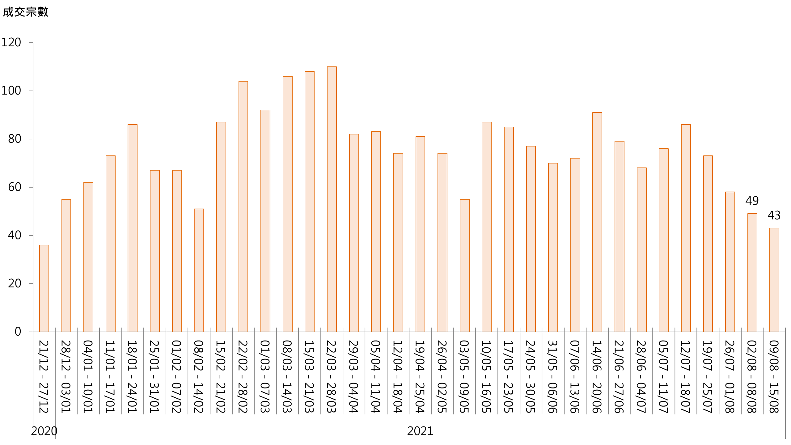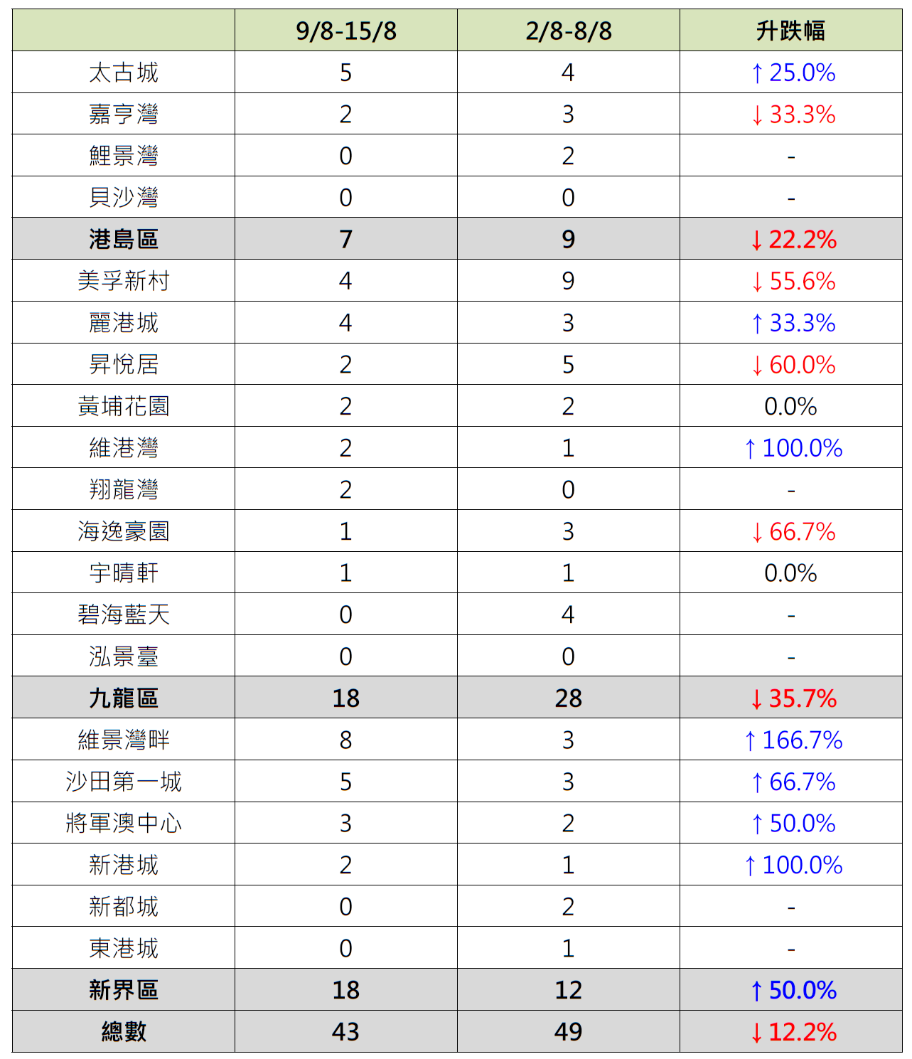 据本行前线分行所录得的数字显示,综合过去一星期(8月9日至8月15日)全港20大主要屋苑二手买卖录43宗成交,较前周(8月2日至8月8日)的49宗减少约12.2%(见图)。