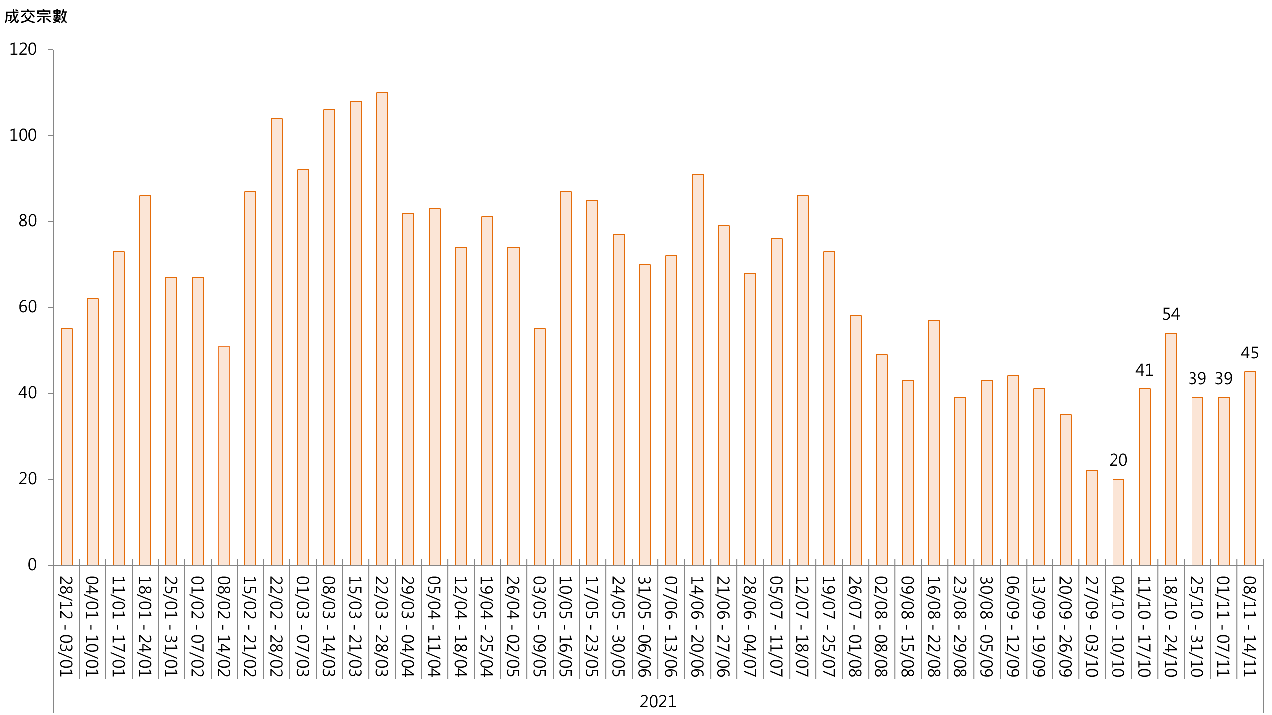 据本行前线分行所录得的数字显示,综合过去一星期(11月8日至11月14日)全港20大主要屋苑二手买卖录45宗成交,较前周(11月1日至11月7日)的39宗增加约15.4%,创近3周新高(见图)。