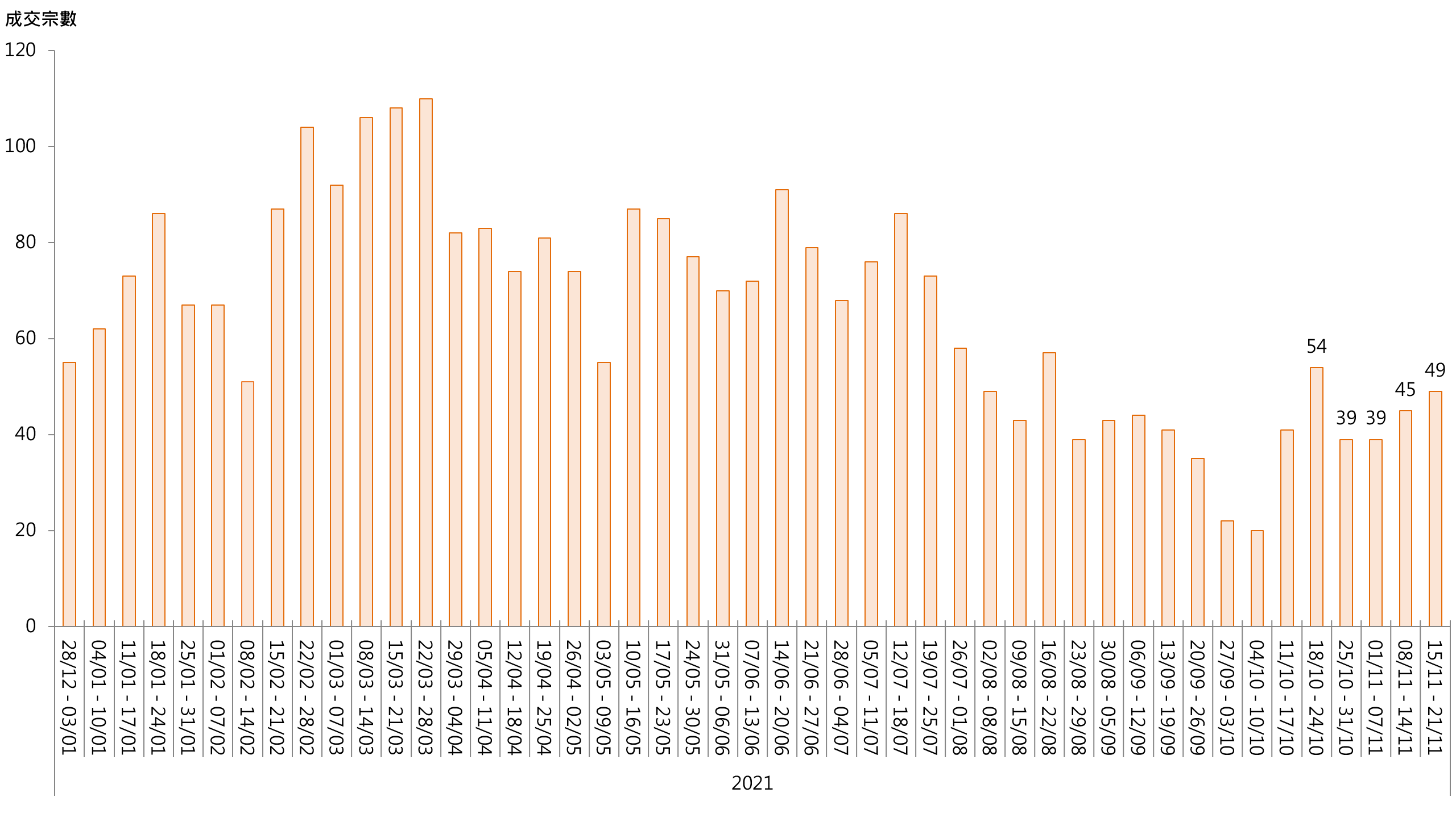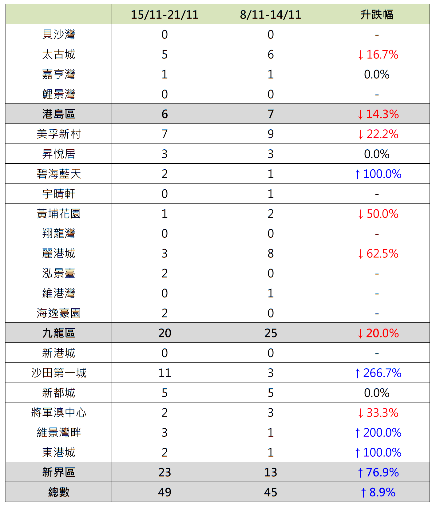 据本行前线分行所录得的数字显示,综合过去一星期(11月15日至11月21日)全港20大主要屋苑二手买卖录49宗成交,较前周(11月8日至11月14日)的45宗增加约8.9%,创近4个星期新高(见图)。