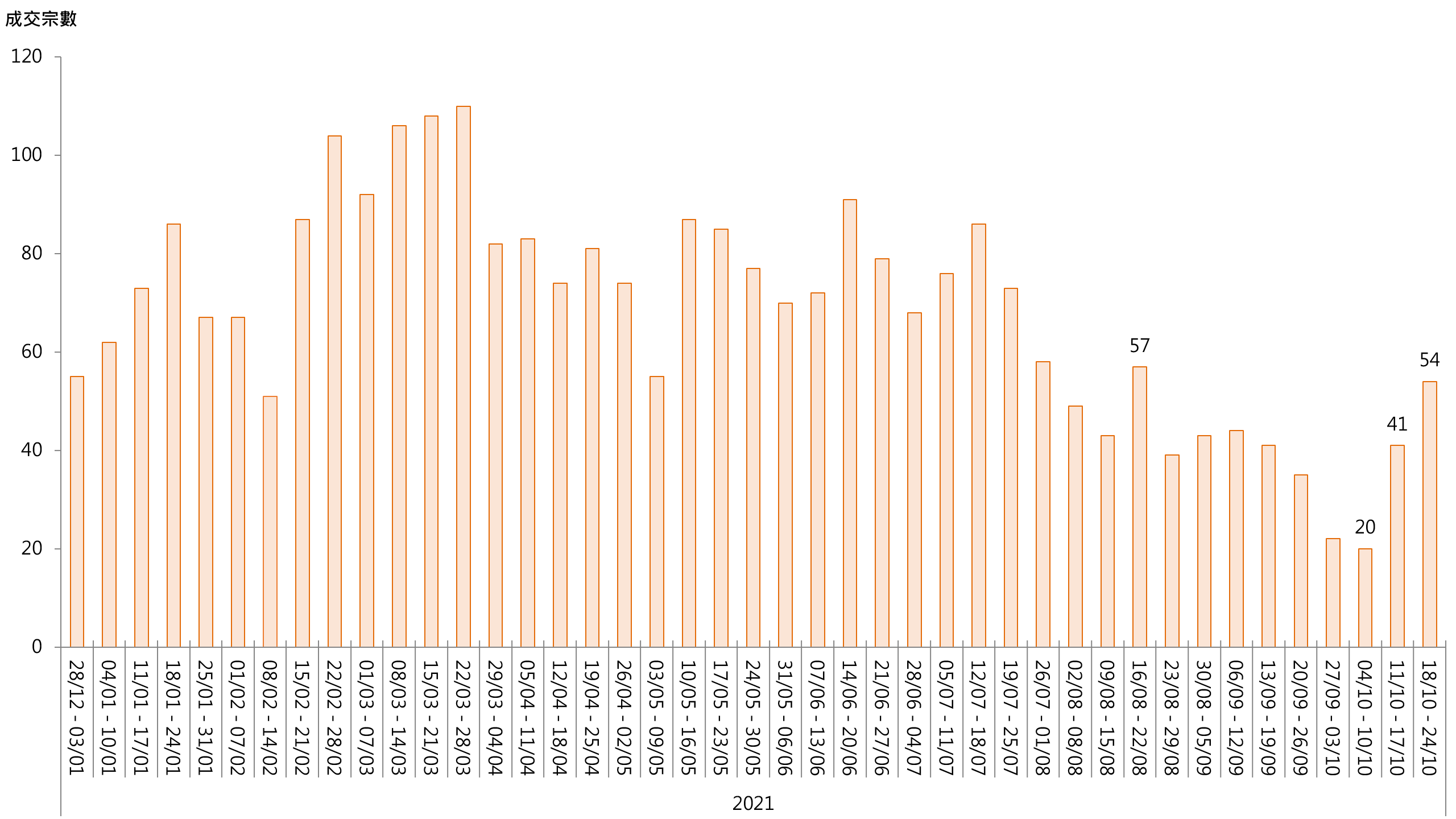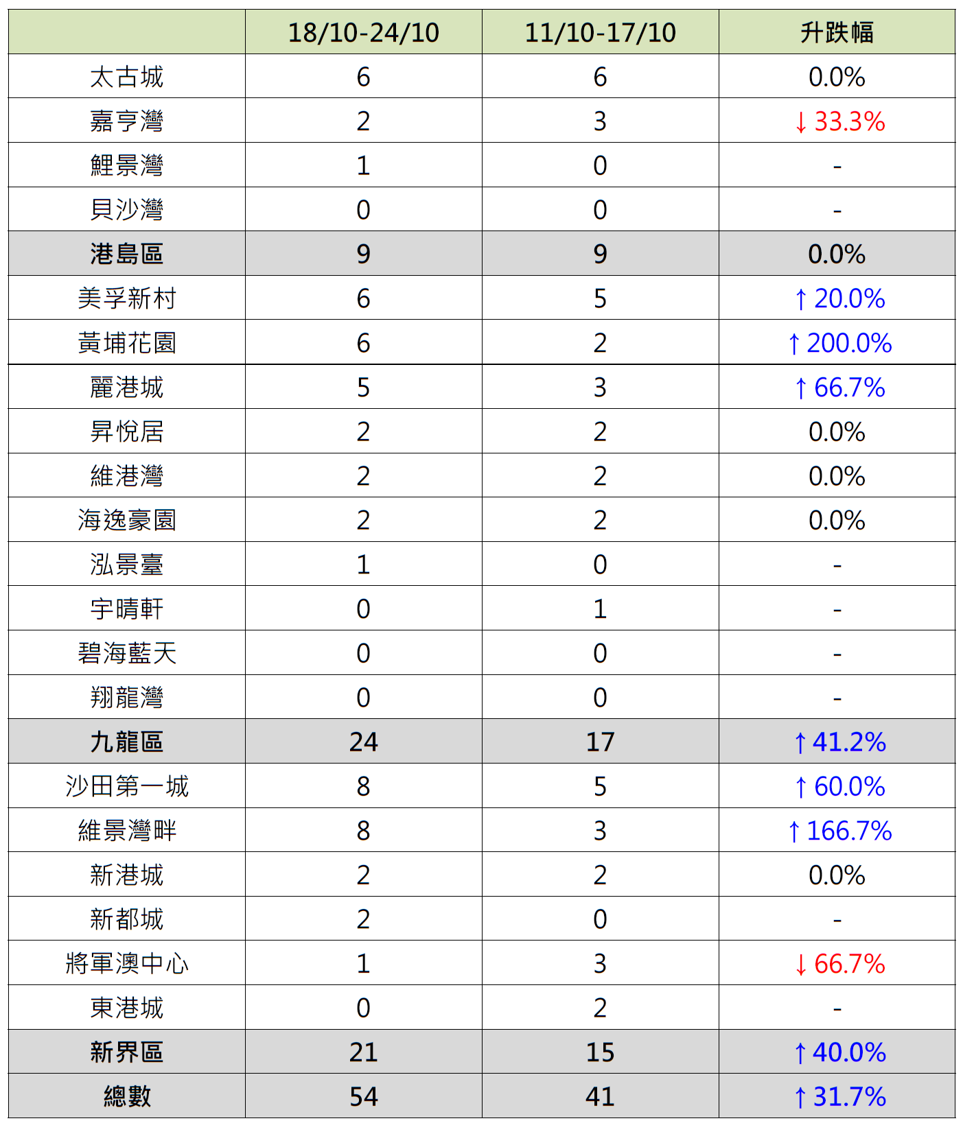 据本行前线分行所录得的数字显示,综合过去一星期(10月18日至10月24日)全港20大主要屋苑二手买卖录54宗成交,较前周(10月11日至10月17日)的41宗增加约31.7%,连升两周,创近9周新高(见图)。