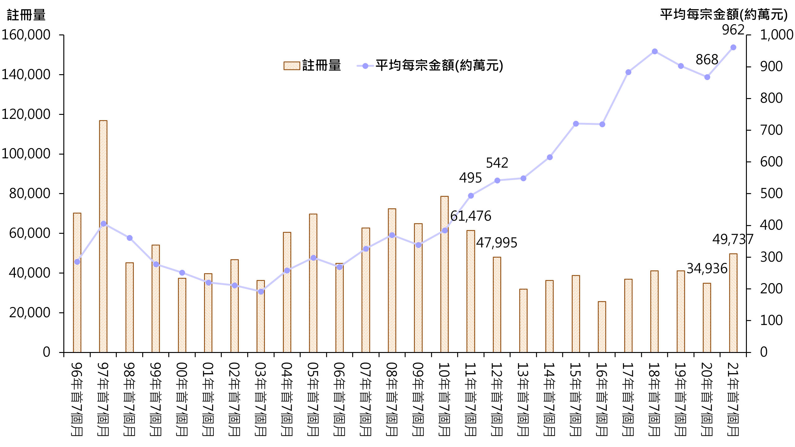 据土地注册处最新资料显示,21年首7个月录49,737宗整体住宅物业注册(包括一手私宅,二手住宅,但撇除一手公营房屋),较去年同期的34,936宗增加约42.4%,创近10年同期新高;而整体住宅平均每宗注册金额亦由去年同期约868万元,增加约10.8%,至今年首7个月约962万元,更创自96年有纪录以来的同期新高(见图)。