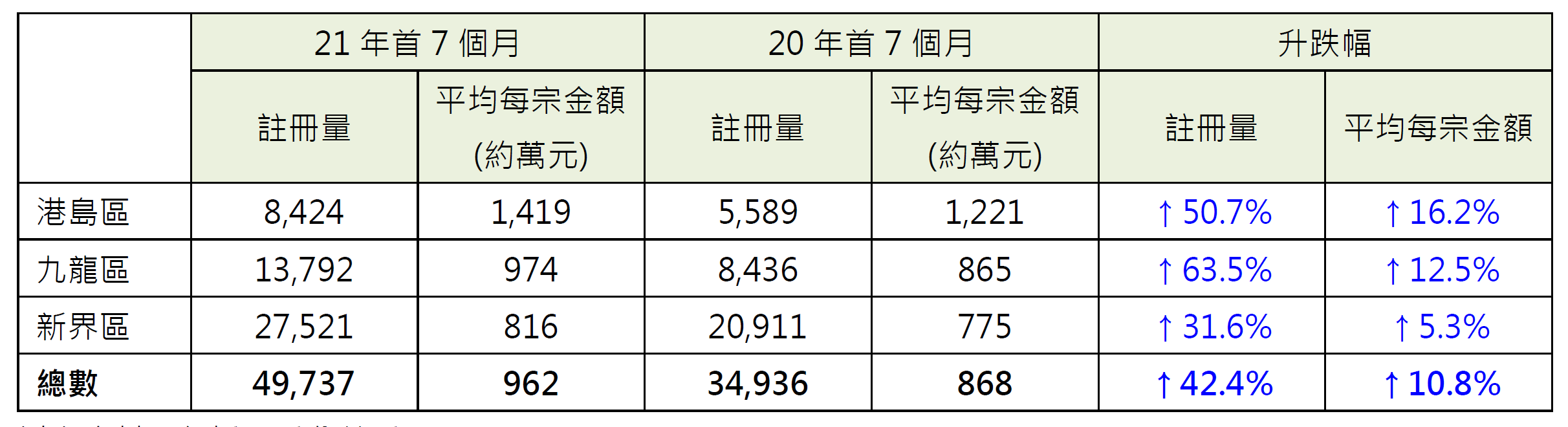 表:21年首7个月各区整体住宅物业注册数字与去年同期比较