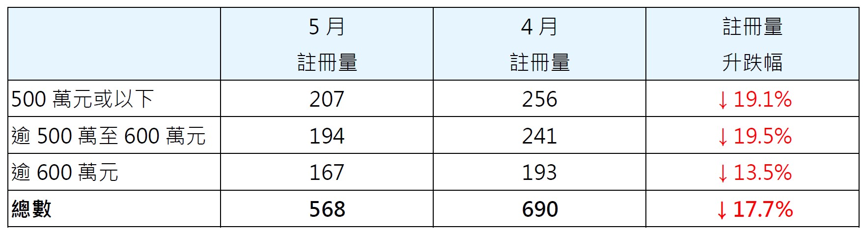 表一︰按金额划分5月二手居屋注册量与4月比较