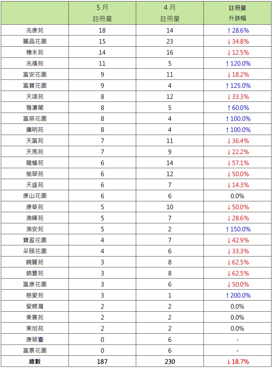 报升屋苑中,慈云山慈爱苑录3宗注册,较4月的1宗增加2倍;鸭脷洲渔安苑录5宗注册,较4月的2宗增加1.5倍;马鞍山富宝花园录9宗注册,较4月的4宗增加1.25倍。