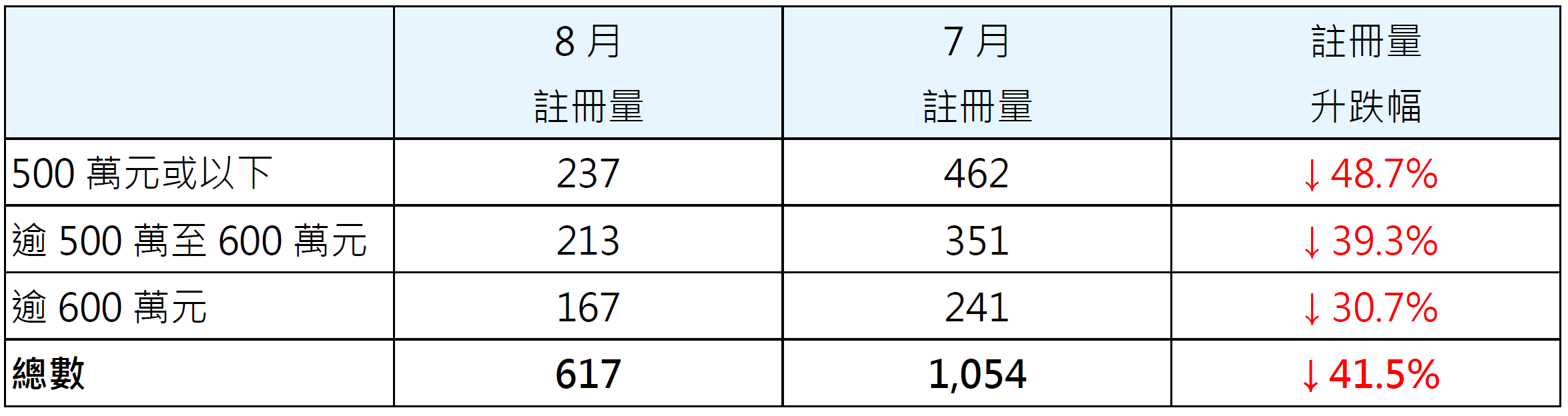 表一︰按金额划分8月二手居屋注册量与7月比较