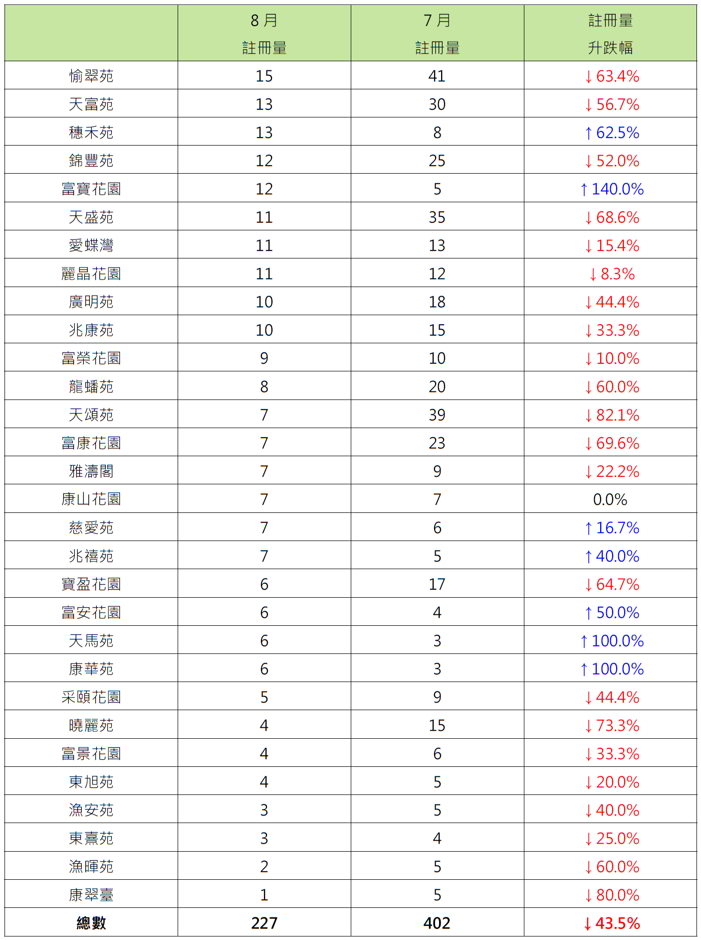 而8月二手居屋注册量屋苑排名方面,沙田愉翠苑以15宗注册居榜首,较7月的41宗减少约63.4%;天水围天富苑及火炭穗禾苑各以13宗注册并列第二,分别较7月的30宗及8宗减少约56.7%及增加62.5%(见表二)。