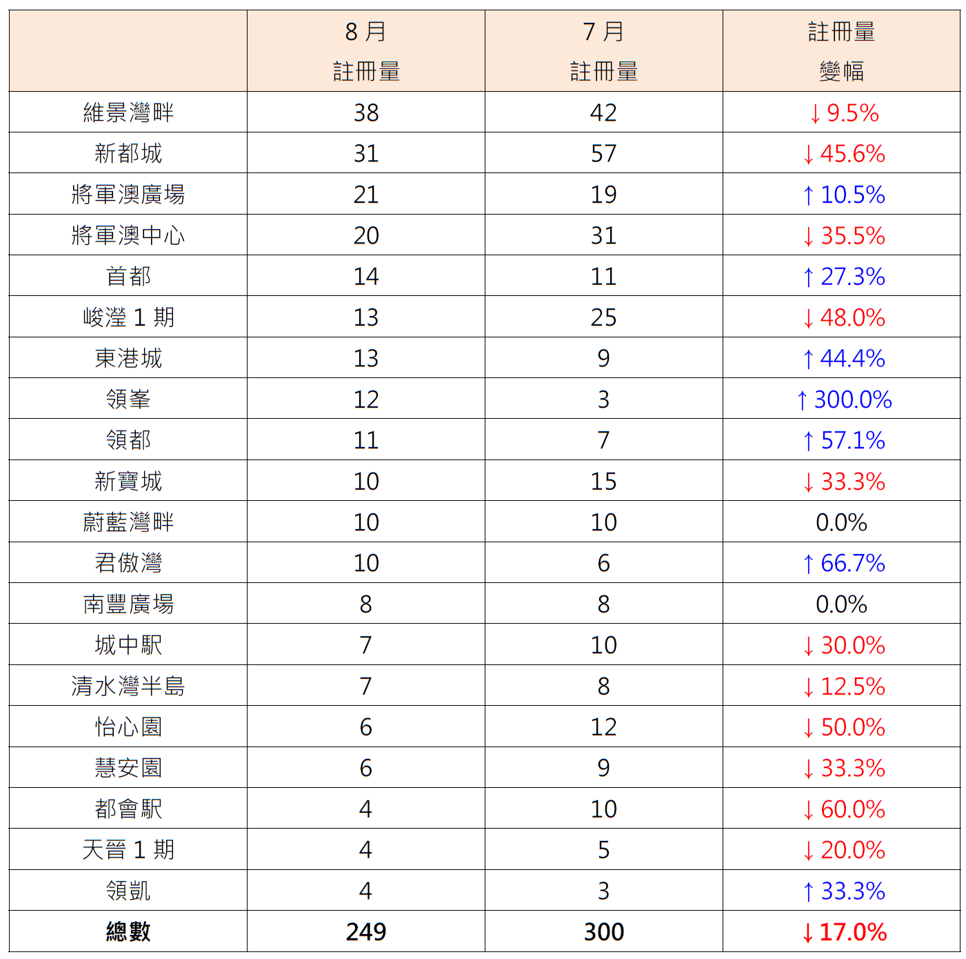 表:8月将军澳区20个私人屋苑二手注册量与7月比较