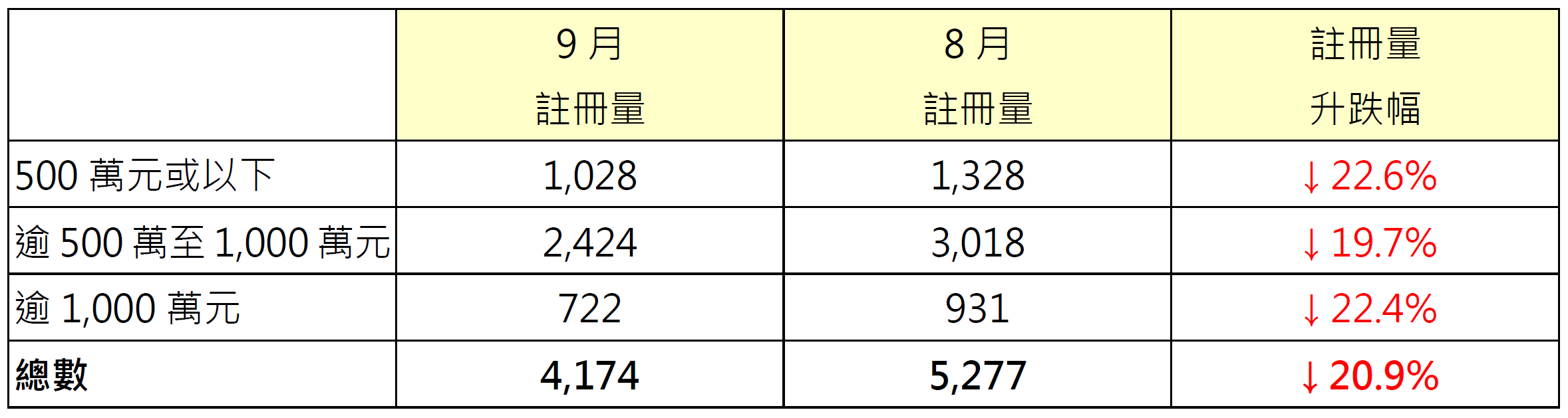 若按金额划分9月二手住宅注册量表现,当中价值500万以上至1,000万元二手住宅物业录2,424宗注册,较8月的3,018宗减少约19.7%;价值1,000万元以上二手住宅物业录722宗注册,较8月的931宗减少约22.4%;价值500万元或以下二手住宅物业录1,028宗注册,较8月的1,328宗减少约22.6%(见表)。