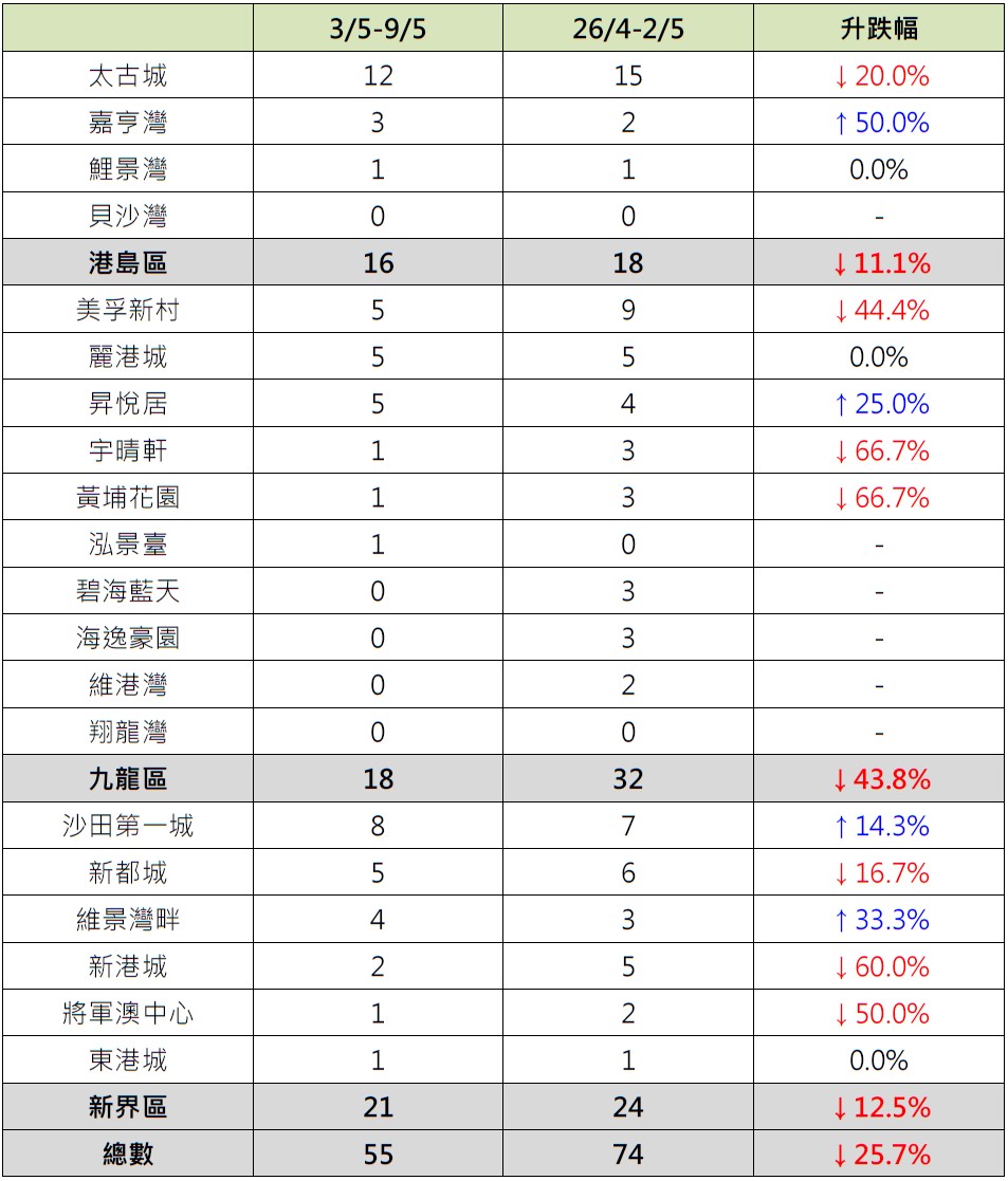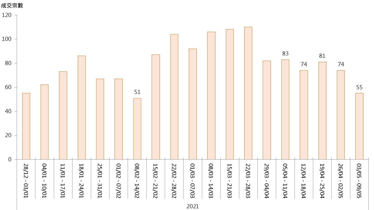 新盘连续两周末热卖,抢去二手市场购买力,二手交投按周再放缓。据本行前线分行所录得的数字显示,综合过去一星期(5月3日至5月9日)全港20大主要屋苑二手买卖录55宗成交,较前周(4月26日至5月2日)的74宗减少约25.7%,连跌两周,创近3个月新低(见图)。