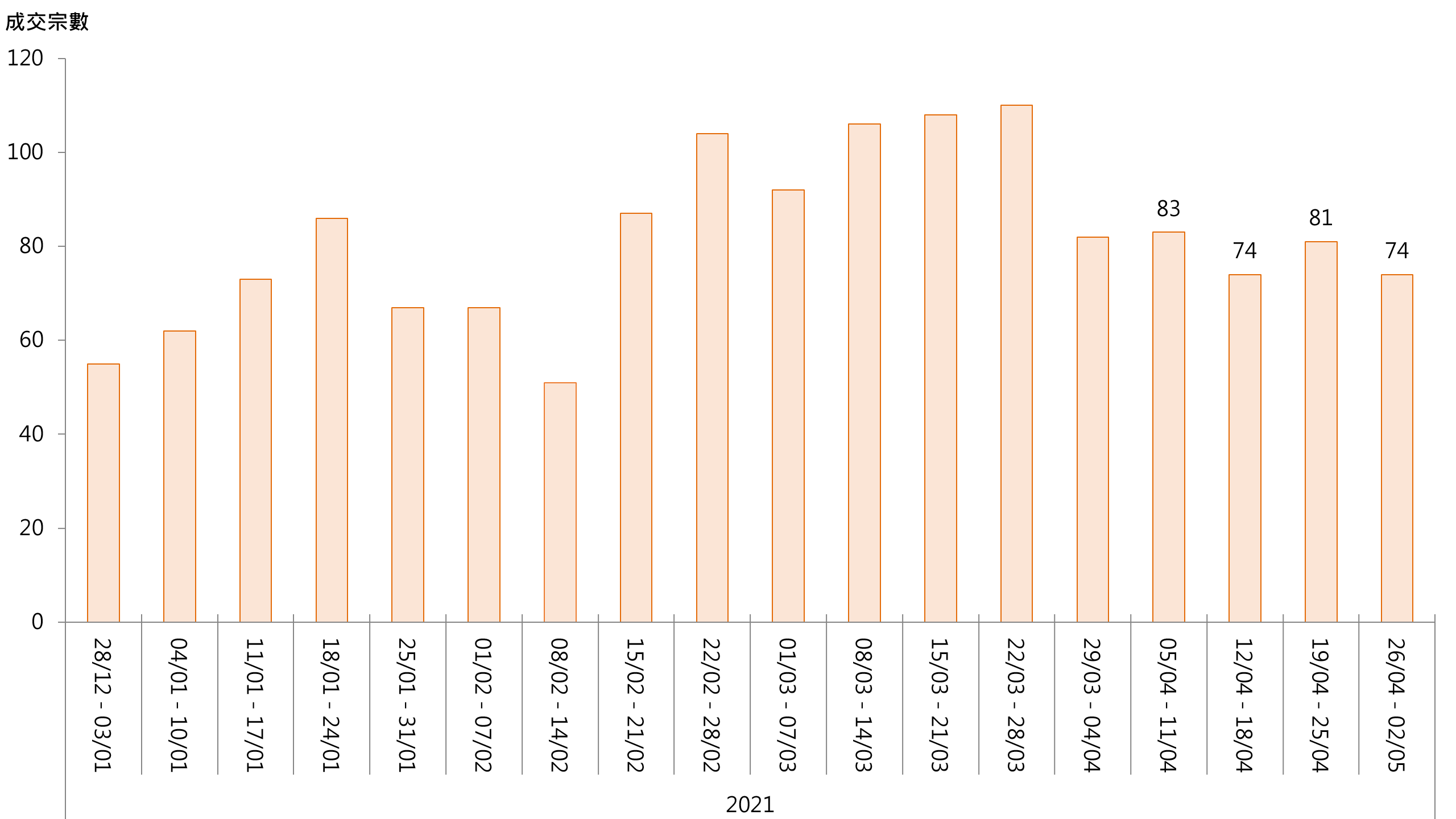 上周末新盘交投畅旺,抢去二手市场购买力,加上二手业主议价空间收窄,故二手交投略为放缓。据本行前线分行所录得的数字显示,综合过去一星期(4月26日至5月2日)全港20大主要屋苑二手买卖录74宗成交,较前周(4月19日至4月25日)的81宗减少约8.6%(见图)。