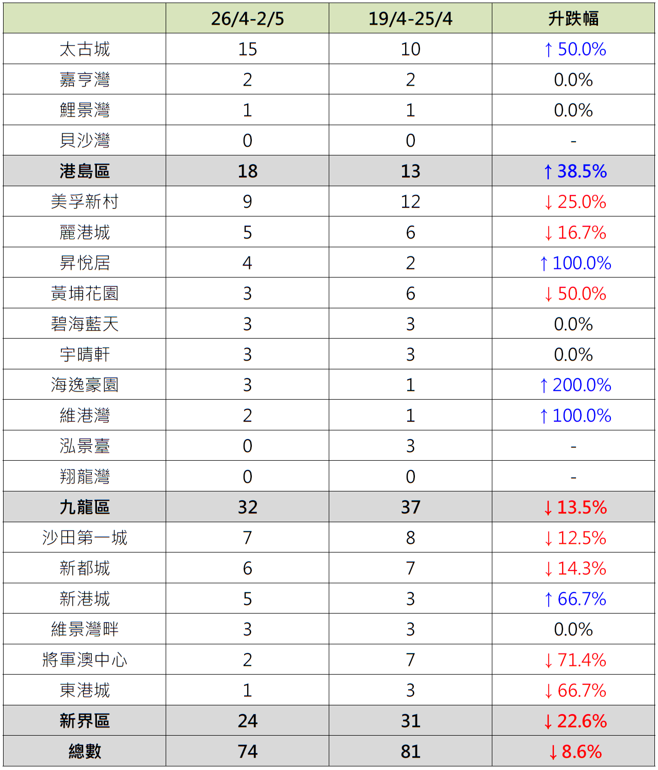 反观,港岛区4个指标屋苑上周录18宗成交,按周增加约38.5%;当中太古城录15宗成交,按周增加50%;嘉亨湾及鲤景湾分别录得2宗及1宗成交,按周同样持平。