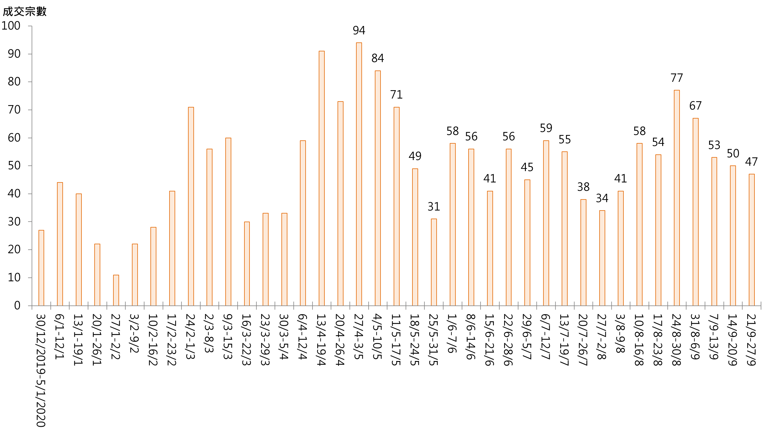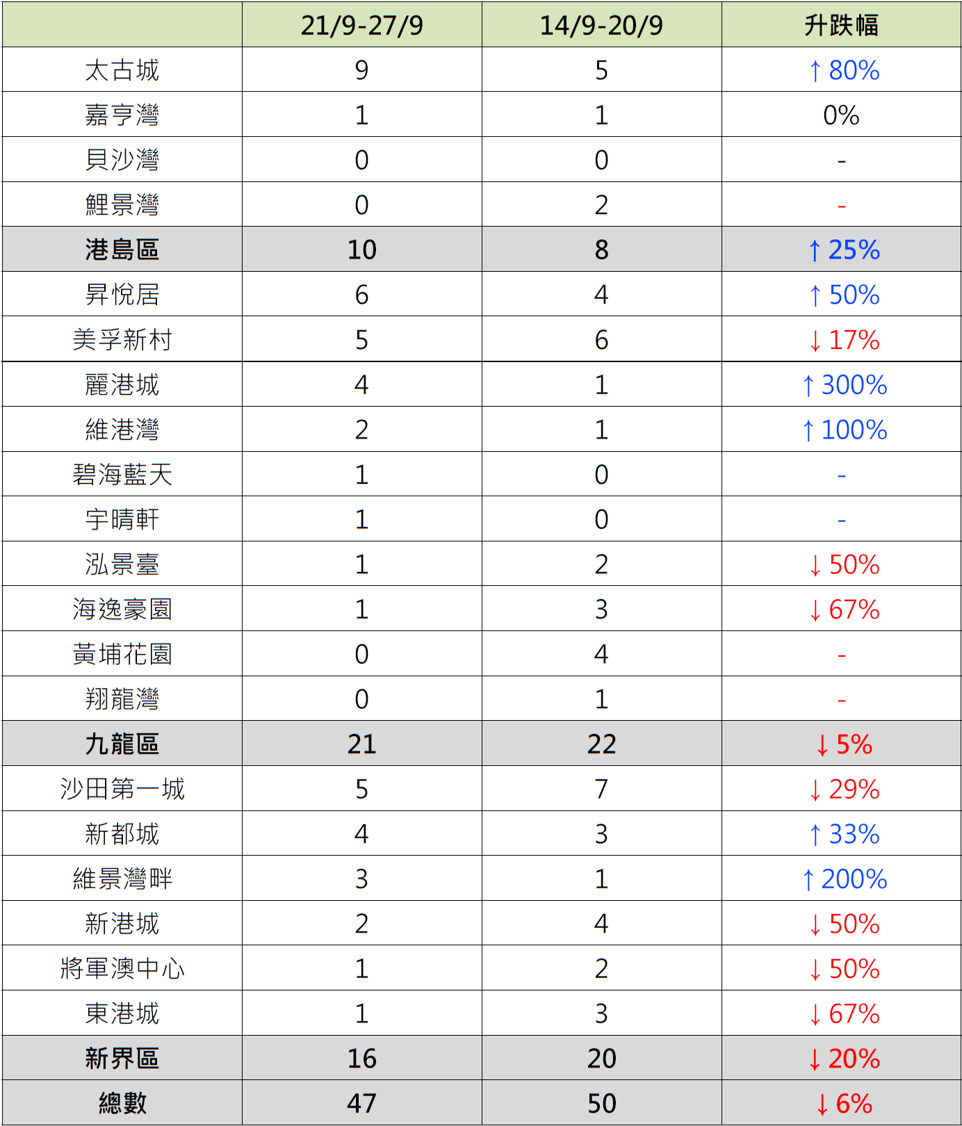 过去周末多个一手新盘同步推售,抢去市场焦点,拖累二手交投放缓。据本行前线分行所录得的数字显示,综合过去一星期 (9月21日至9月27日) 全港20大主要屋苑二手买卖录47宗成交,较前周(9月14日至9月20日)的50宗减少约6% (见图)。