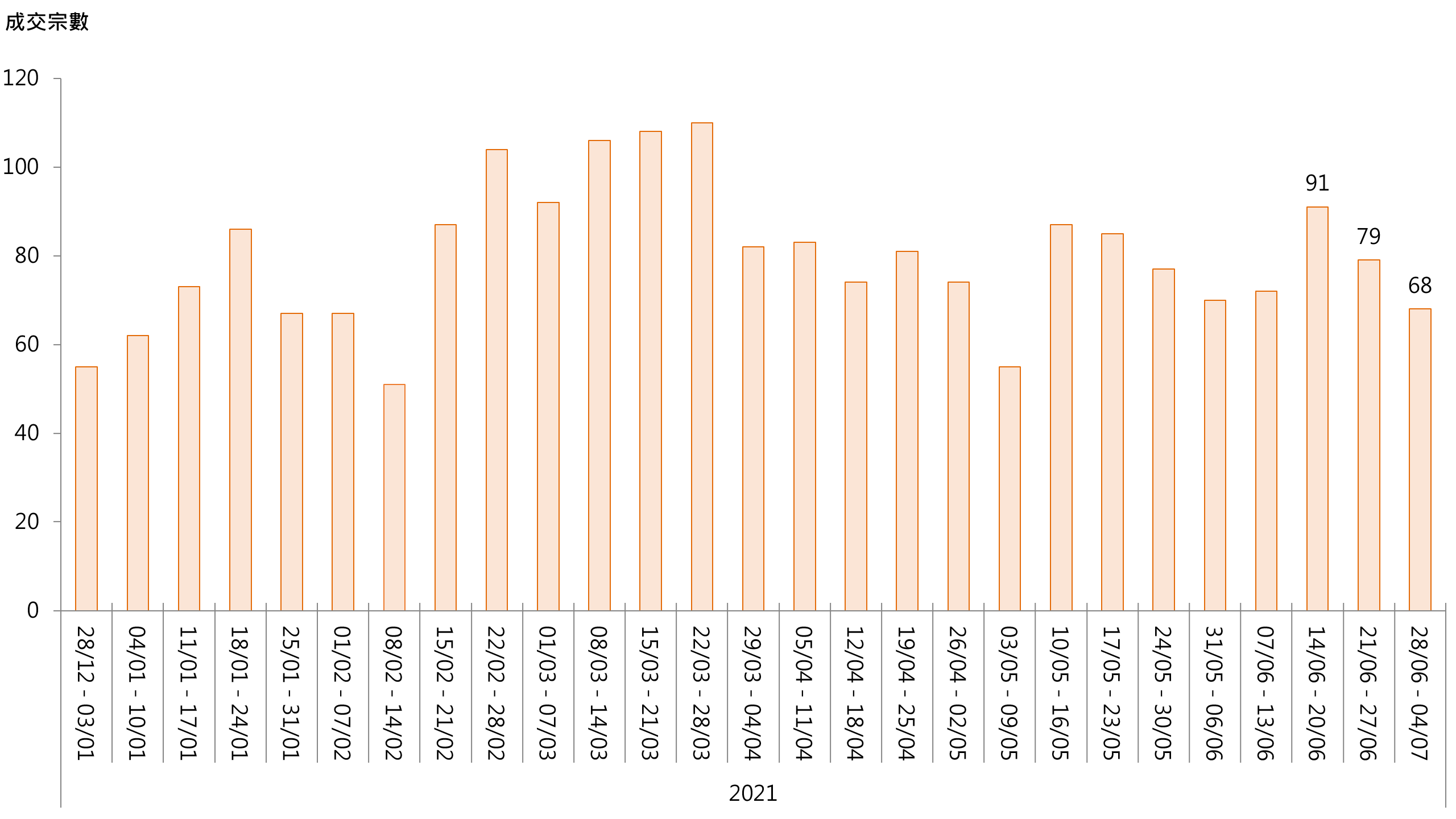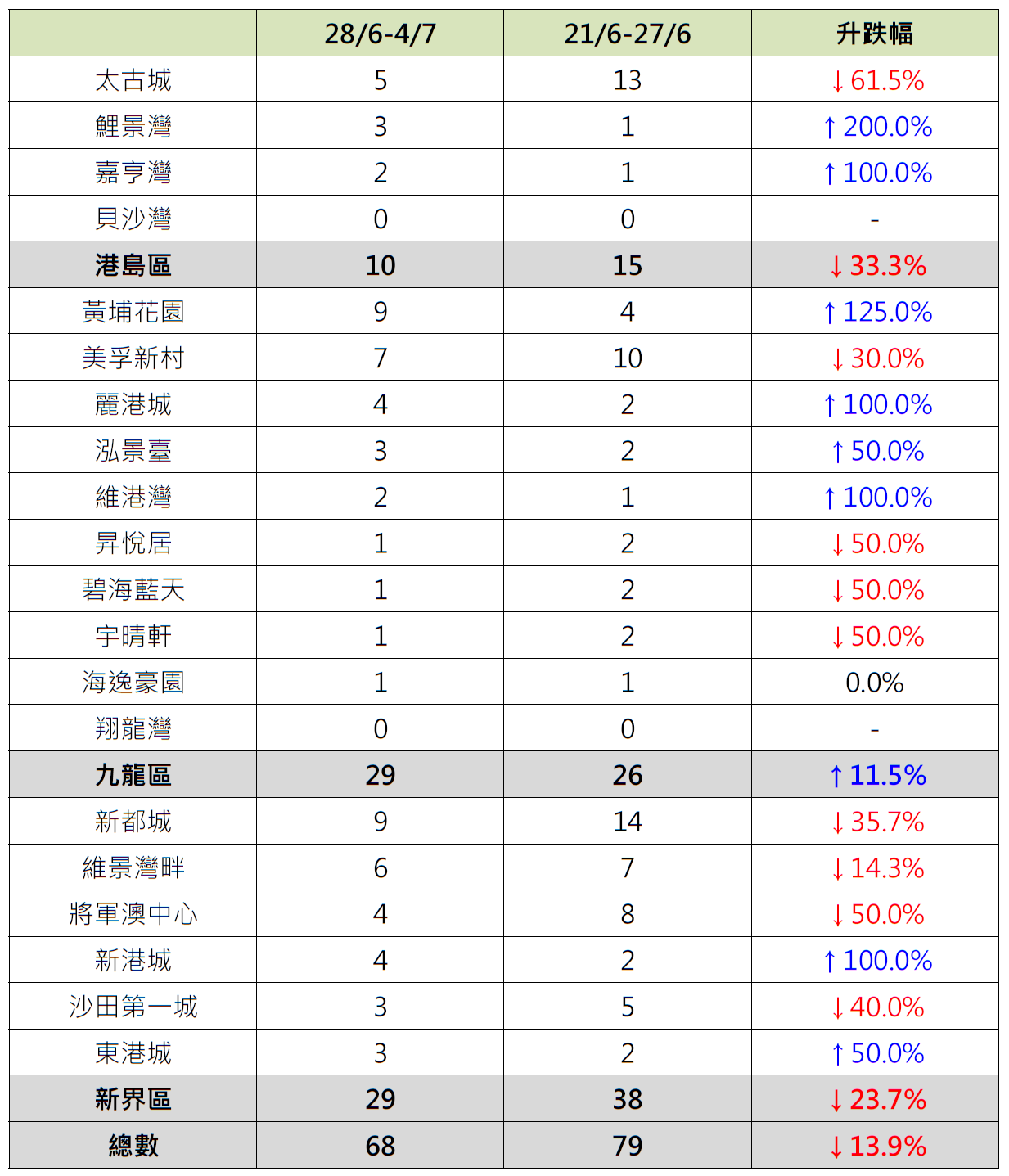 据本行前线分行所录得的数字显示,综合过去一星期(6月28日至7月4日)全港20大主要屋苑二手买卖录68宗成交,较前周(6月21日至6月27日)的79宗减少约13.9%(见图)。