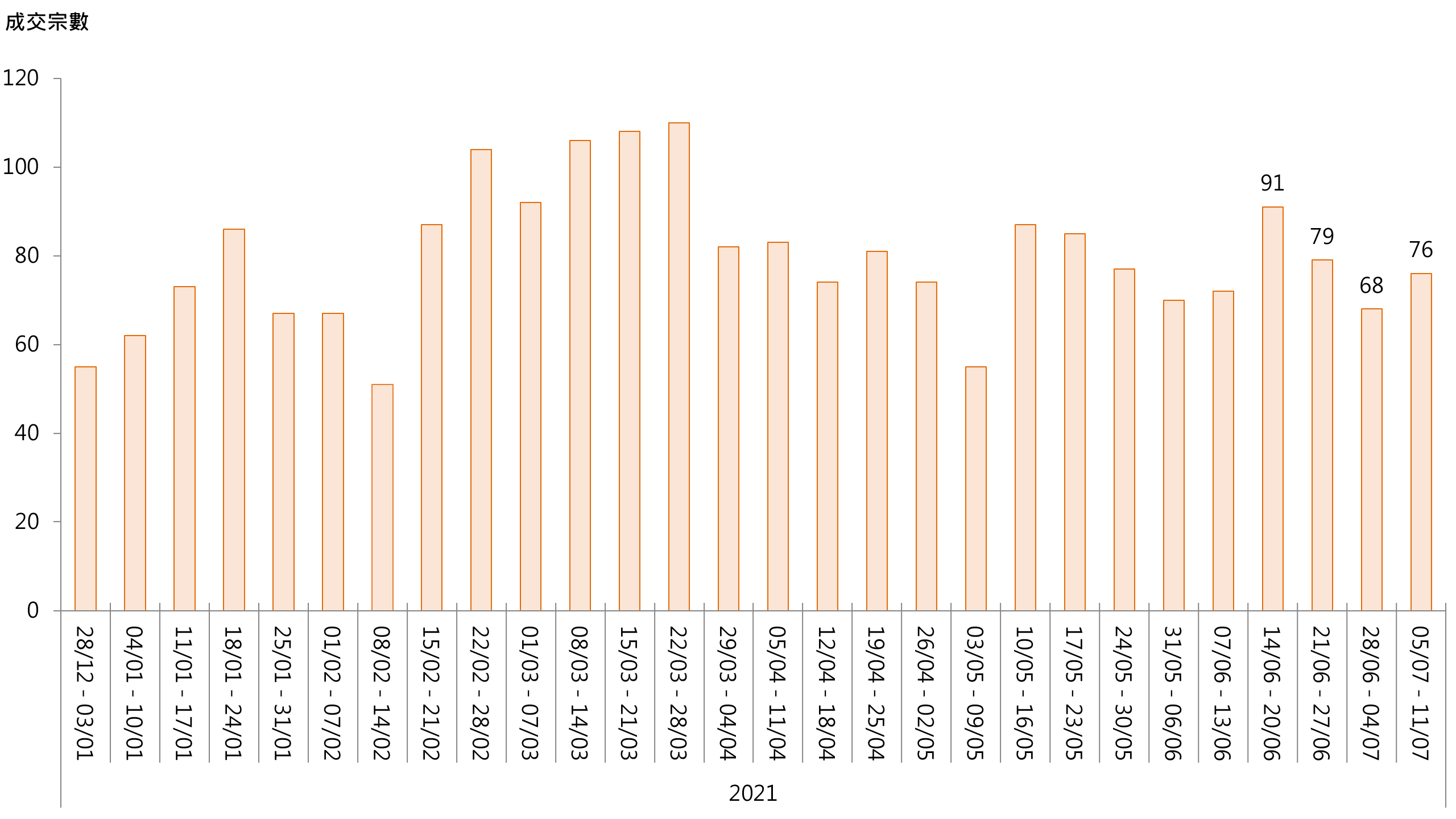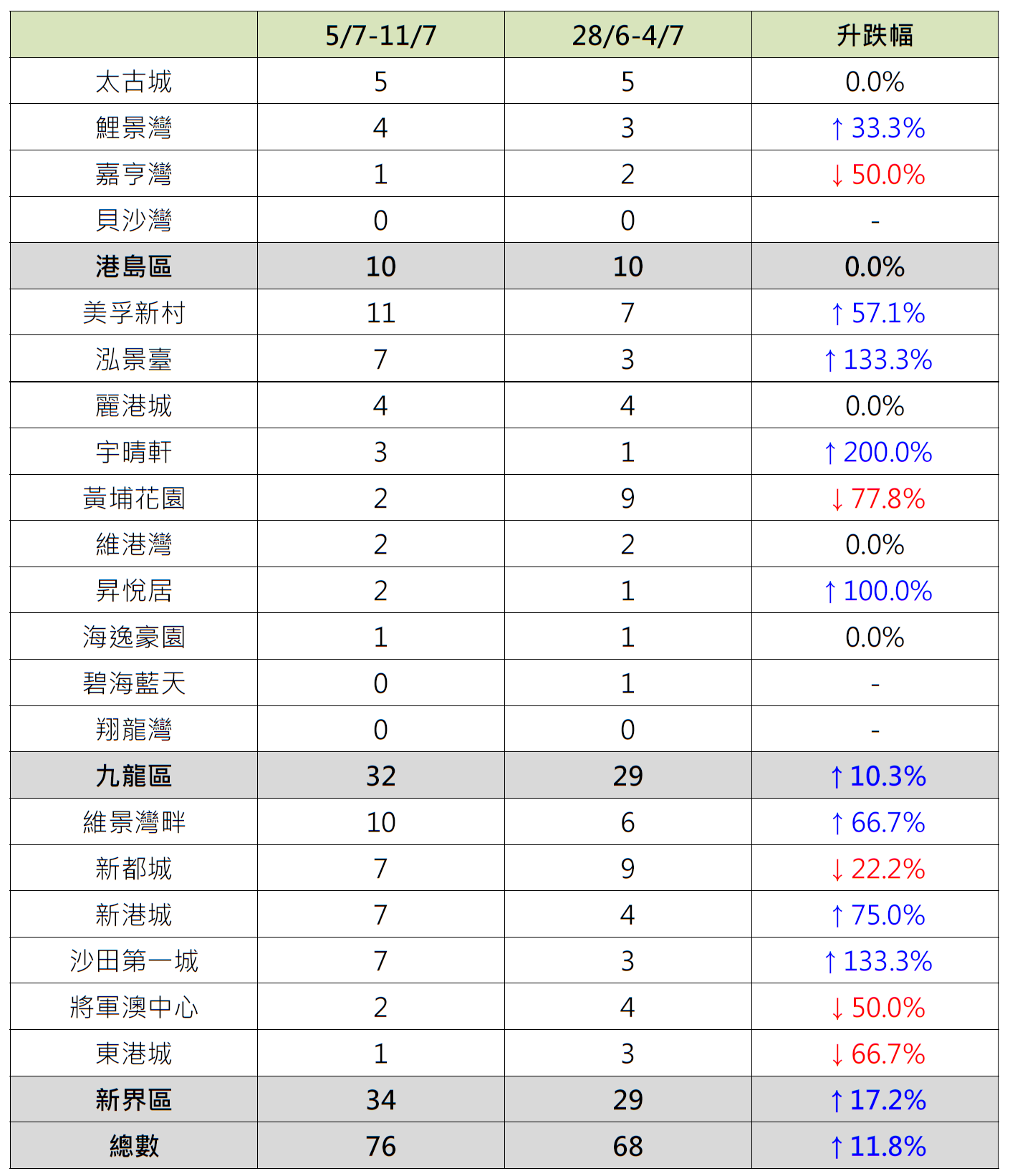 据本行前线分行所录得的数字显示,综合过去一星期(7月5日至7月11日)全港20大主要屋苑二手买卖录76宗成交,较前周(6月28日至7月4日)的68宗增加约11.8%(见图)。