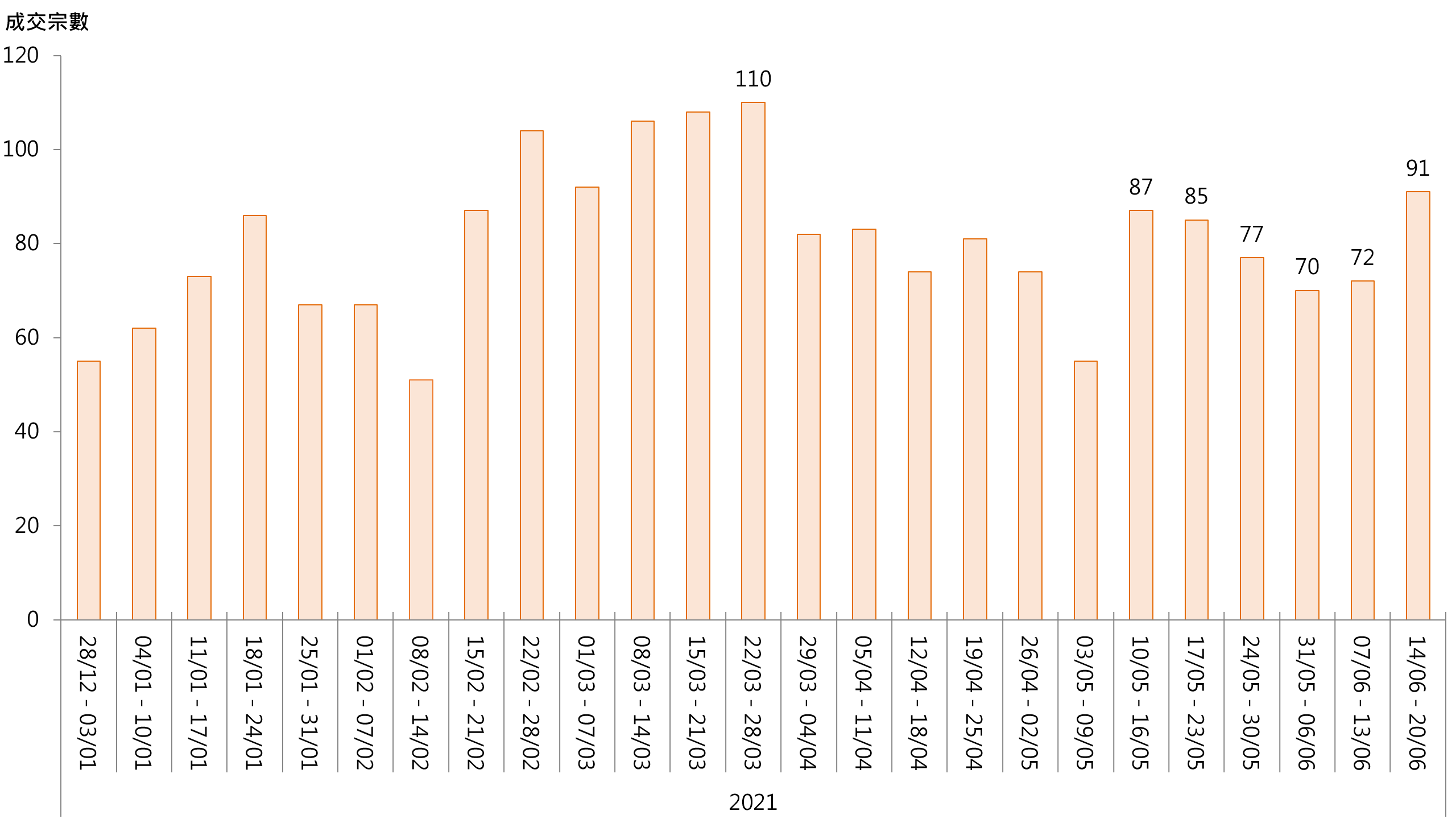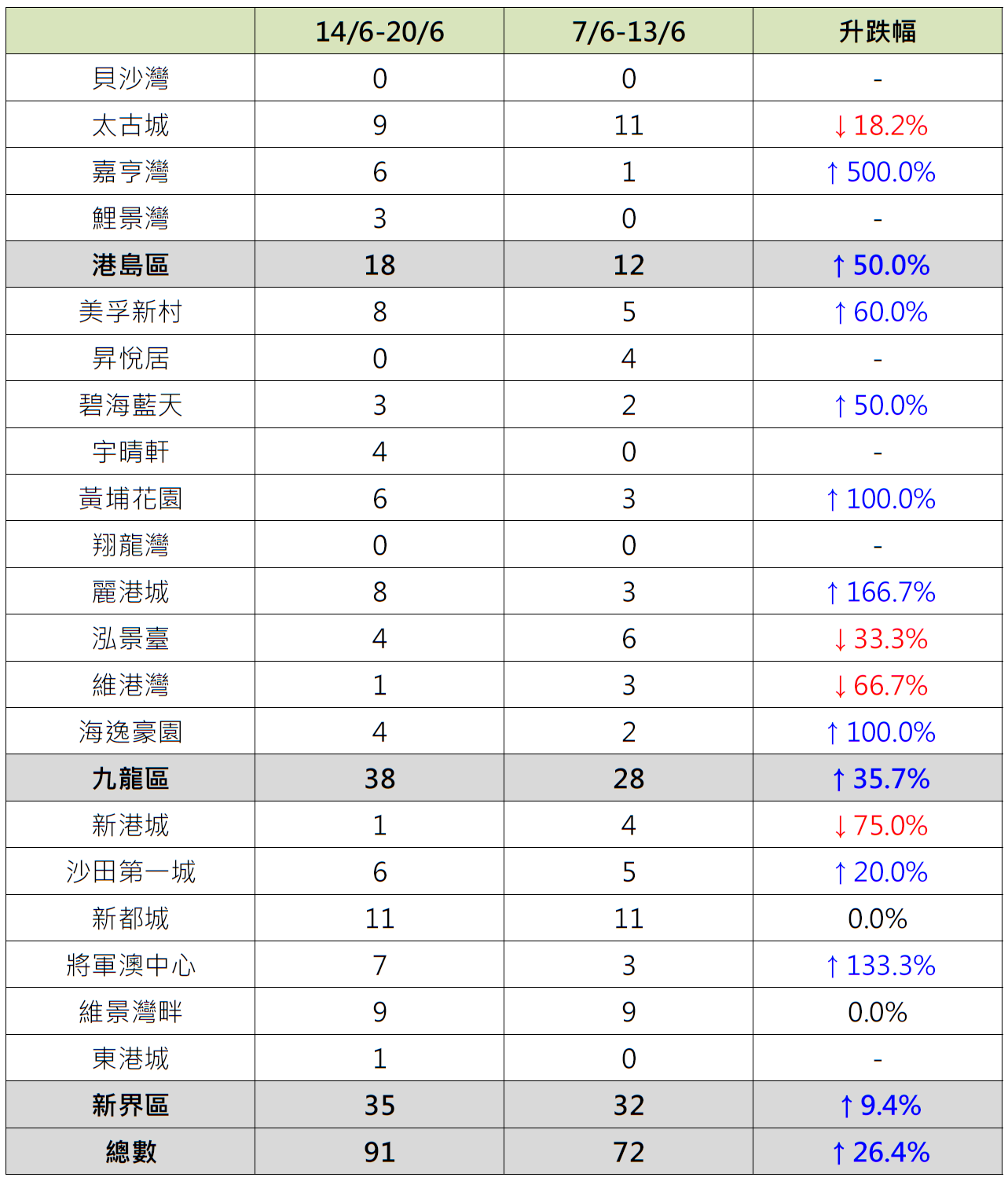 据本行前线分行所录得的数字显示,综合过去一星期(6月14日至6月20日)全港20大主要屋苑二手买卖录91宗成交,较前周(6月7日至6月13日)的72宗增加约26.4%,宗数属近12周最多(见图)。