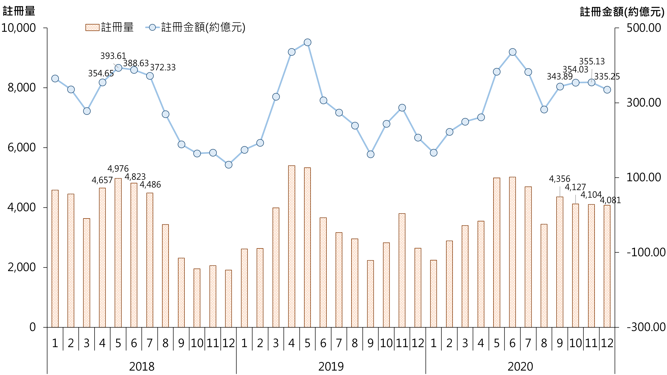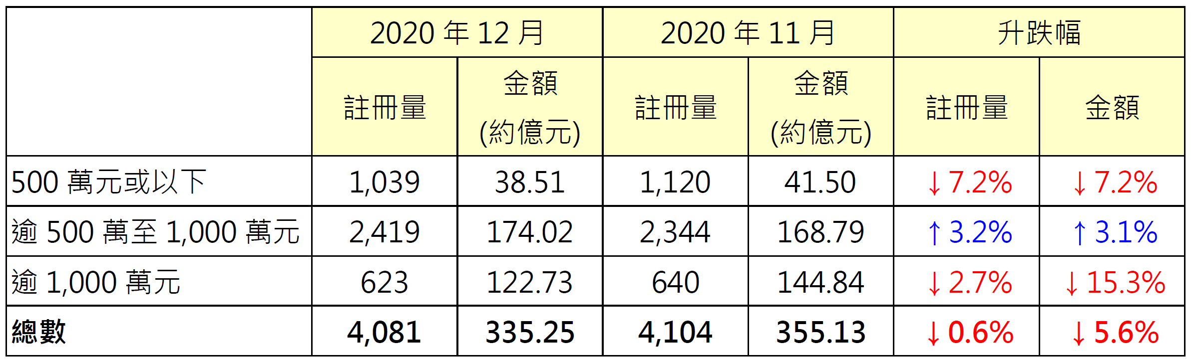据土地注册处资料显示,二手住宅2020年12月录4,081宗注册,较11月的4,104宗微减约0.6%,连续4个月企稳逾4千宗水平,对上一次相同情况亦于2018年4至7月曾出现,即逾2年首次;而二手住宅注册金额录约335.25亿元,较11月约355.13亿元减少约5.6%。鉴于签署买卖合约至递交到土地注册处注册登记需时,12月注册个案一般主要反映11月市况。