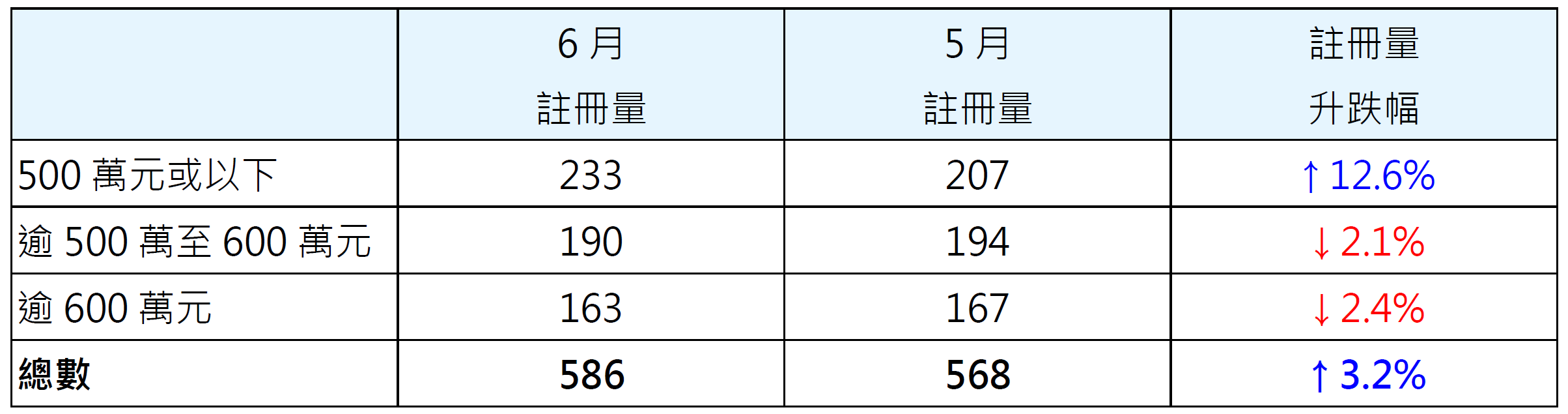 表一︰按金额划分6月二手居屋注册量与5月比较