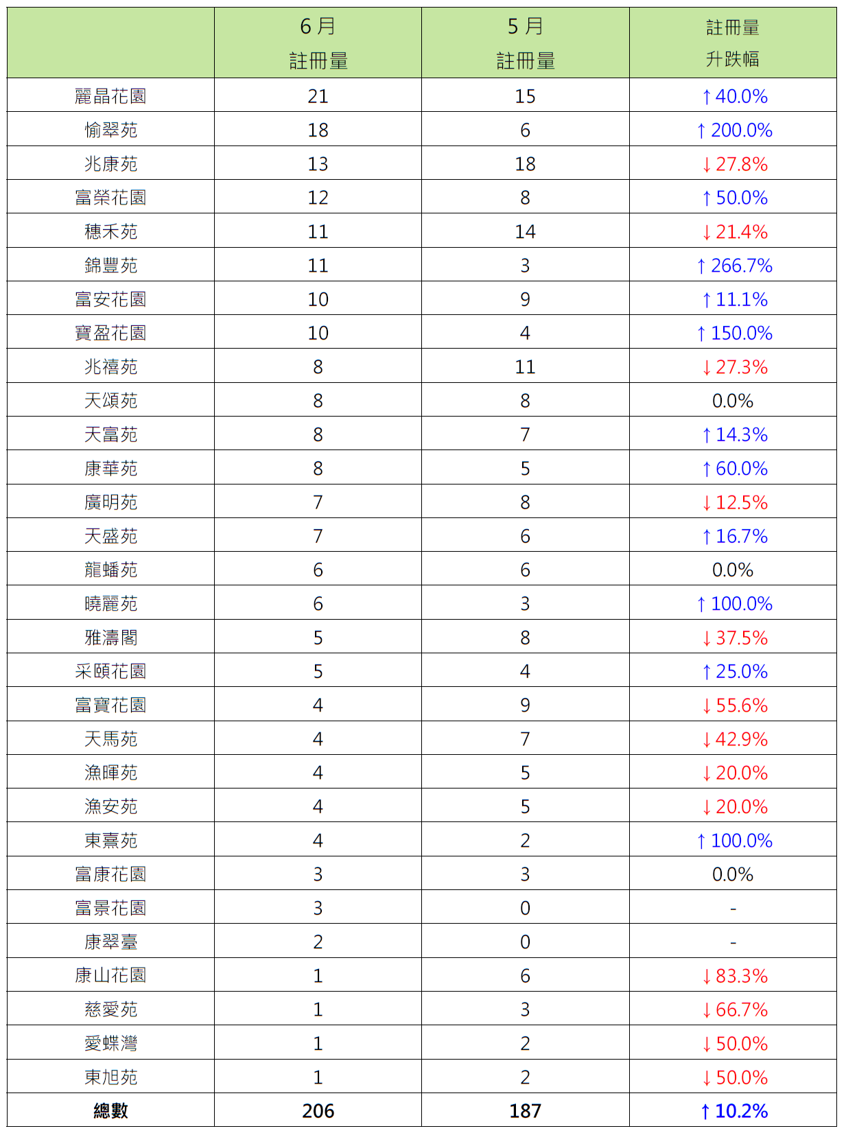 而6月二手居屋注册量屋苑排名方面,九龙湾丽晶花园以21宗注册居榜首,较5月的15宗增加40%;注册量按月大增2倍的沙田愉翠苑,排名第二;而屯门兆康苑以13宗注册排第三,较5月的18宗则减少约27.8%(见表二)。