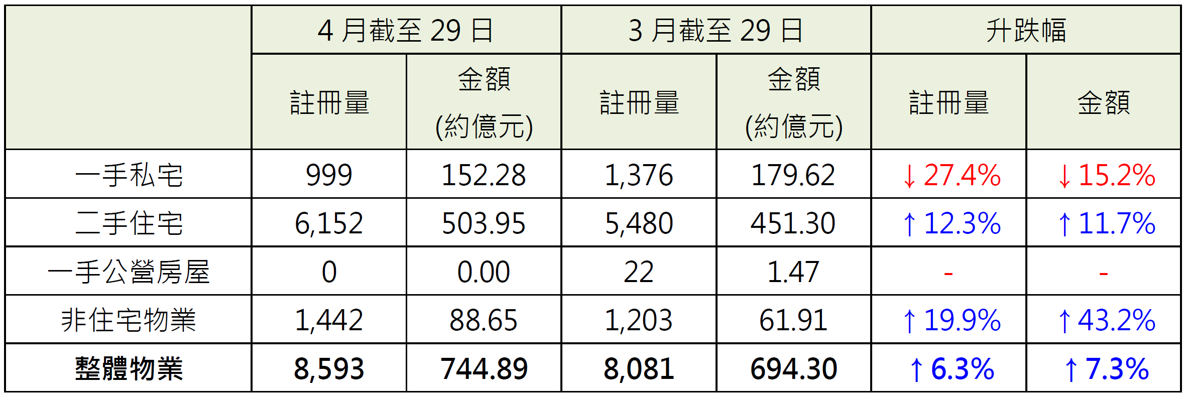 二手住宅4月截至29日录6,152宗注册,较3月同期的5,480宗增加约12.3%;涉及注册金额录约503.95亿元,较3月同期约451.30亿元增加约11.7%。