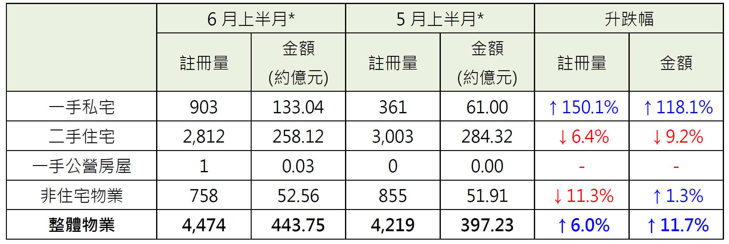据土地注册处资料显示,6月上半月(截至15日)整体物业(包括一、二手住宅、一手公营房屋、工商舖及车位)录4,474宗注册,较5月上半月(截至15日)的4,219宗增加约6%;涉及注册金额录约443.75亿元,较5月上半月约397.23亿元增加约11.7%。鉴于签署买卖合约至递交到土地注册处注册登记需时,6月注册个案一般主要反映5月市况。