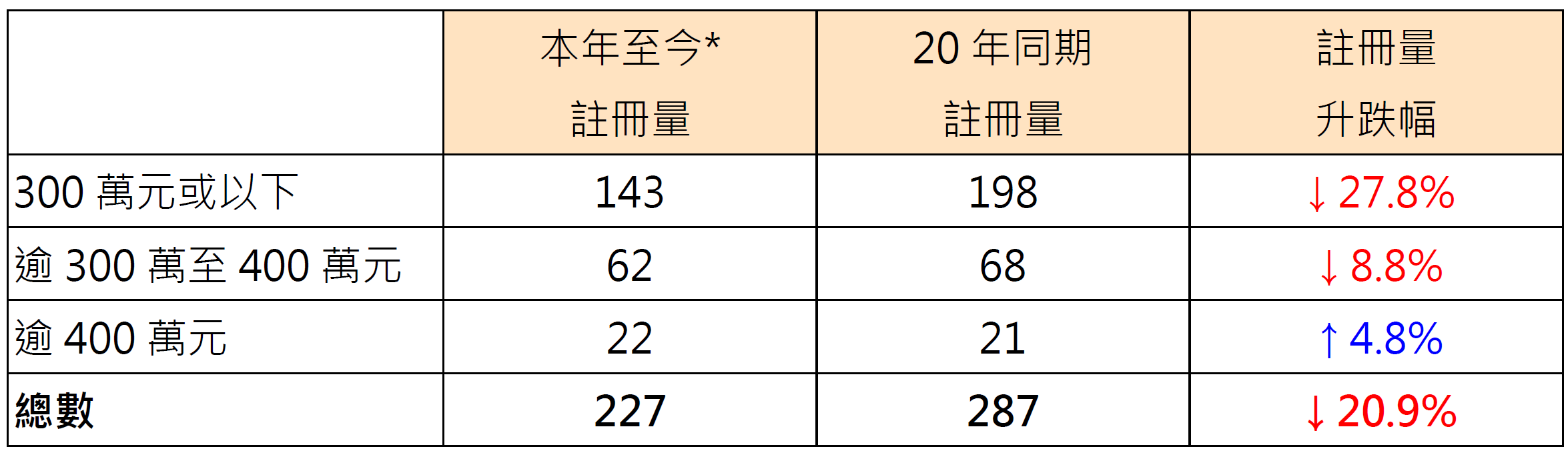 表︰按金额划分本年至今*二手公屋注册量与20年同期比较