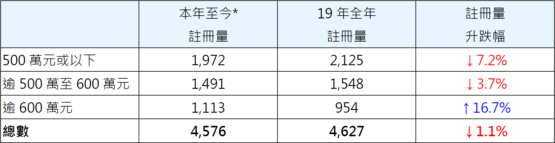 表一︰按金额划分本年至今*二手居屋注册量与19年全年比较