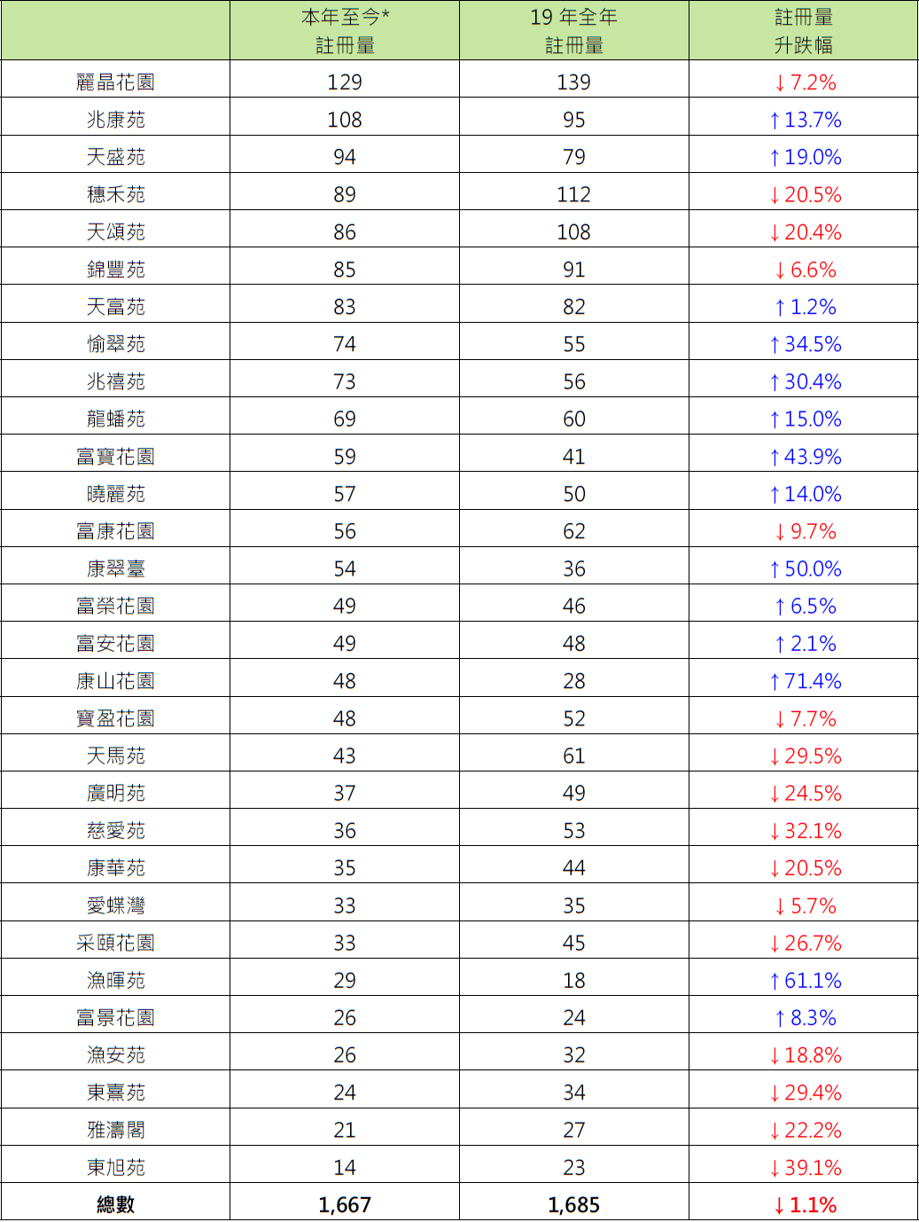 本年至今表现较好的屋苑中,鲗鱼涌康山花园录48宗注册,较去年全年高出约71.4%;香港仔渔晖苑录29宗注册,较去年全年高出约61.1%;柴湾康翠台录54宗注册,较去年全年高出50%。