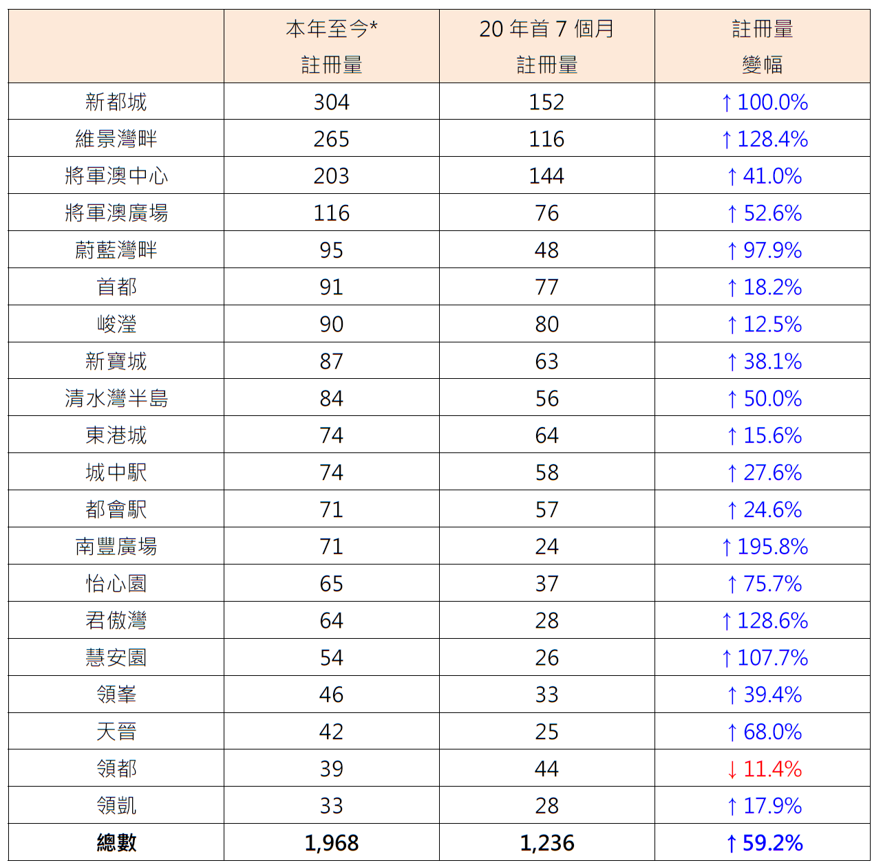 至于本年至今注册量屋苑排名方面,新都城暂以304宗注册居榜首,较去年首7个月的152宗高出1倍;交投同样大升的维景湾畔,暂以265宗注册排第二;将军澳中心暂以203宗注册排第三,较去年首7个月的144宗高出约41%(见表)。
