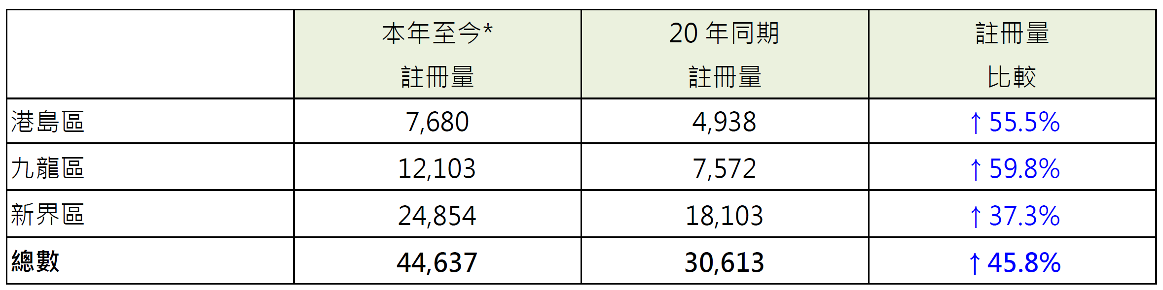 若以港岛、九龙及新界三区划分本年至今住宅物业注册量表现,当中新界区录24,854宗注册,较去年同期的18,103宗增加约37.3%;九龙区录12,103宗注册,较去年同期的7,572宗增加约59.8%;港岛区录7,680宗注册,较去年同期的4,938宗增加约55.5%(见表)。