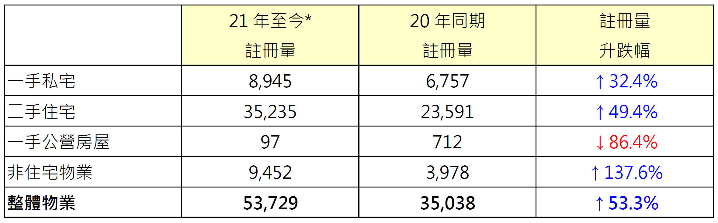 今年疫情渐趋缓和,加上疫苗陆续接种,市场憧憬经济逐渐复苏,准买家入市意欲增加,整体楼市交投与去年同期相比有显著增幅。据土地注册处资料显示,本年至今(截至7月12日)整体物业(包括一、二手住宅、一手公营房屋、工商舖及车位)录53,729宗注册,较去年同期的35,038宗增加约53.3%。鉴于签署买卖合约至递交到土地注册处注册登记需时,每月注册个案一般主要反映前一个月市况。
