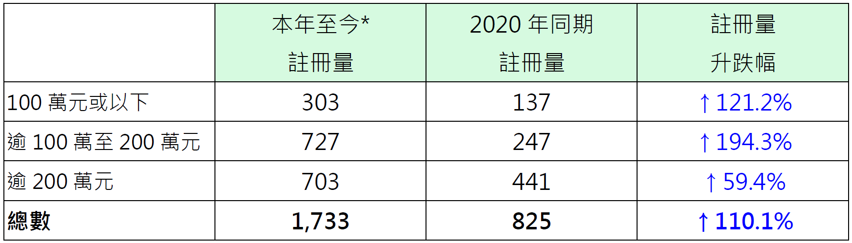 若按金额划分本年至今纯车位注册量表现,其中价值100万元或以下纯车位录303宗注册,较去年同期的137宗增加约1.2倍;价值100万以上至200万元纯车位录727宗注册,较去年同期的247宗增加近2倍;价值200万元以上纯车位录703宗注册,较去年同期的441宗增加约60%(见表)。