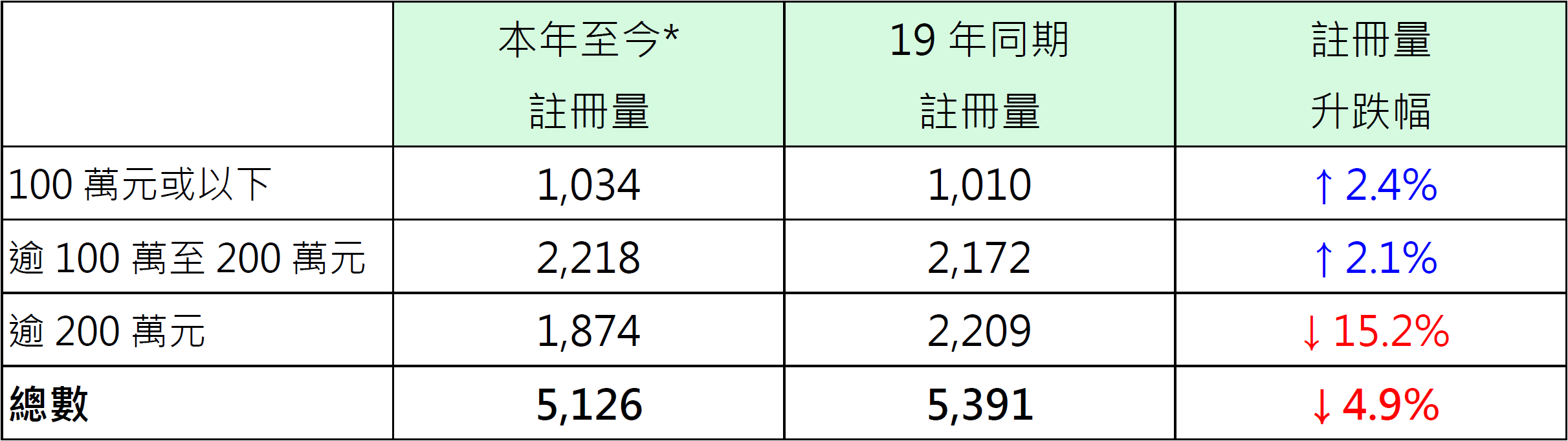 若按金额划分本年至今纯车位注册量表现,其中价值100万元或以下纯车位录1,034宗注册,较去年同期的1,010宗增加约2.4%;价值100万以上至200万元纯车位录2,218宗注册,较去年同期的2,172宗增加约2.1%;价值200万元以上纯车位录1,874宗注册,较去年同期的2,209宗减少约15.2% (见表)。