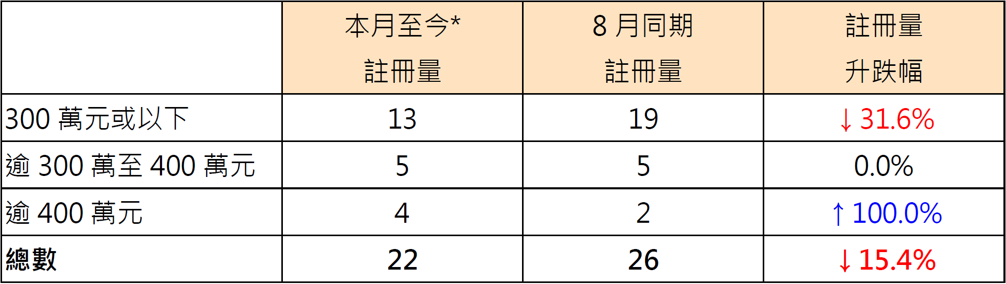 表: 按金额划分本月至今*二手公屋注册量与8月同期比较