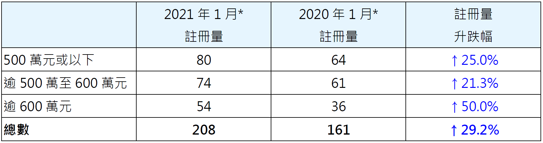 表一︰按金额划分2021年1月*二手居屋注册量与2020年1月*比较