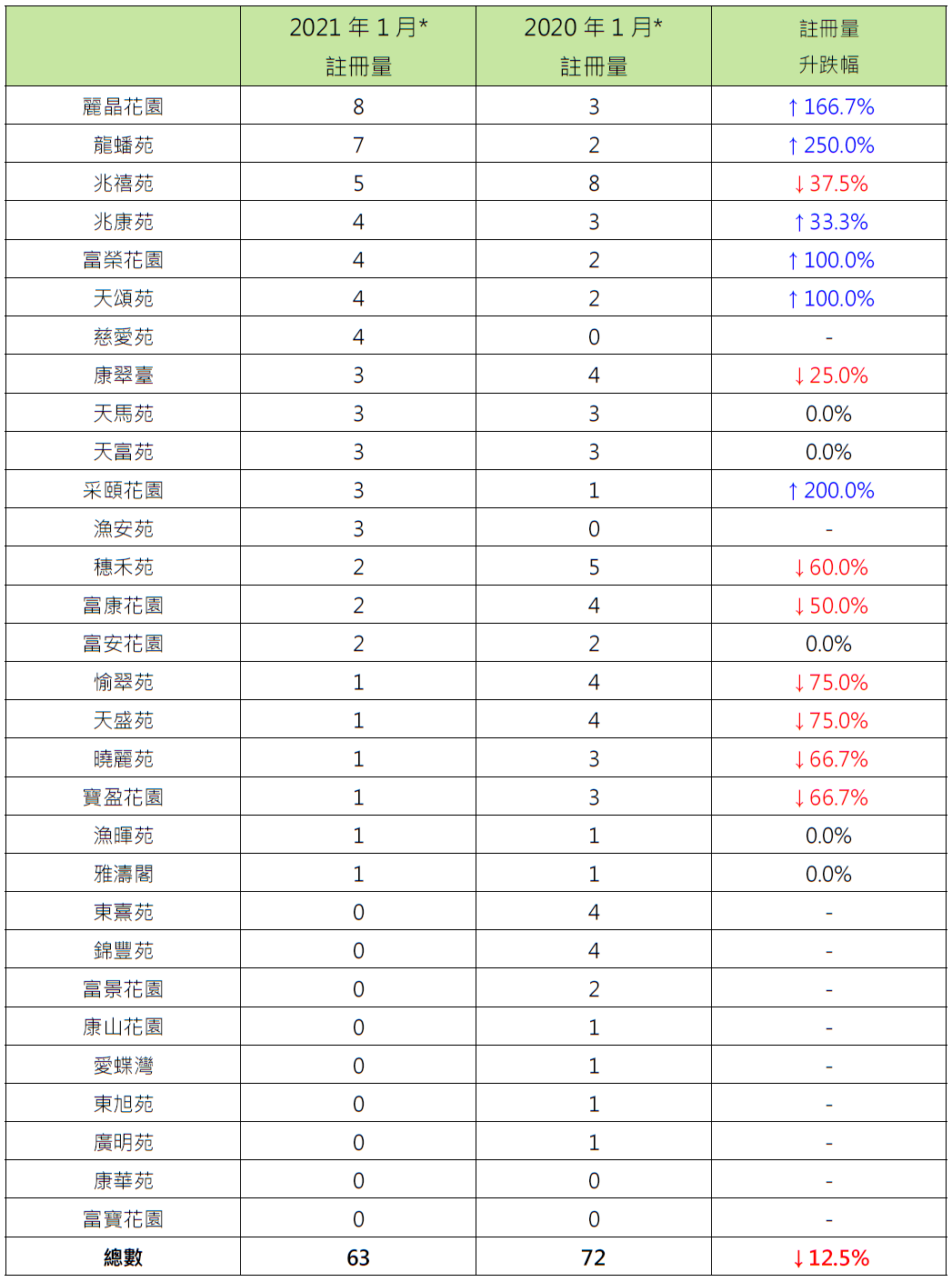 表二︰2021年1月*30个二手居屋屋苑注册量与2020年1月*比较