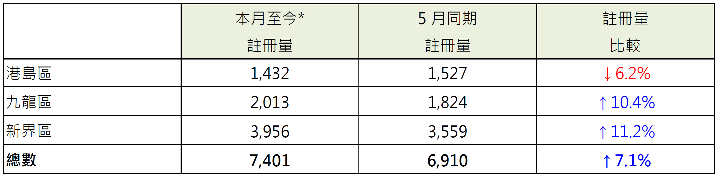 若以港岛、九龙及新界三区划分本月至今住宅物业注册量表现,当中新界区录3,956宗注册,较5月同期的3,559宗增加约11.2%;九龙区录2,013宗注册,较5月同期的1,824宗增加约10.4%;反观,港岛区录1,432宗注册,较5月同期的1,527宗减少约6.2%(见表)。