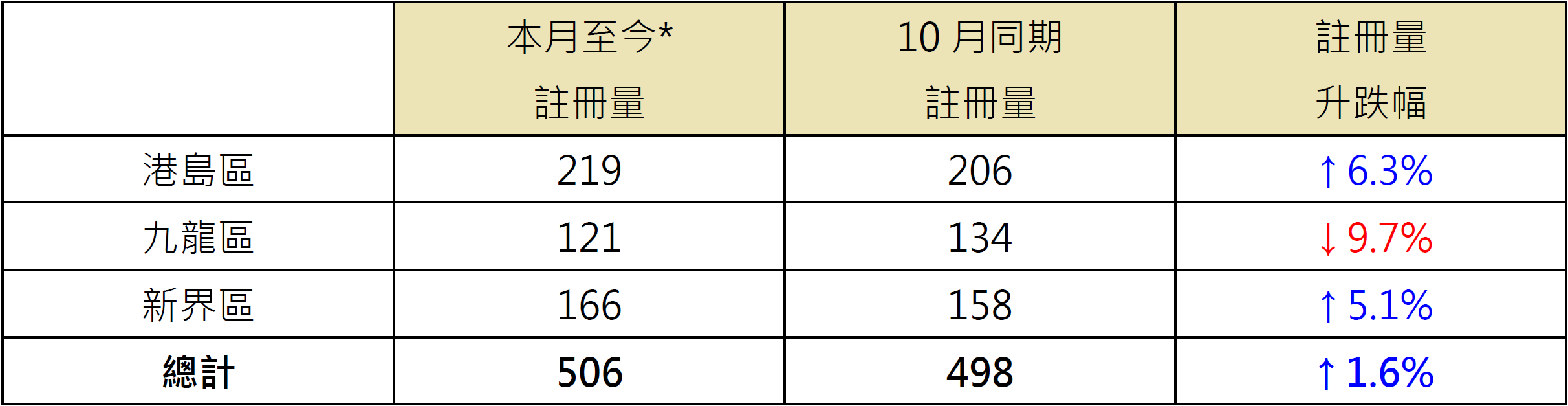 若以港岛、九龙及新界三区划分本月至今逾千万元二手住宅注册量表现,其中港岛区录219宗注册,较10月同期的206宗增加约6.3%;九龙区录121宗注册,较10月同期的134宗则减少约9.7%;而新界区录166宗注册,较10月同期的158宗增加约5.1% (见表)。