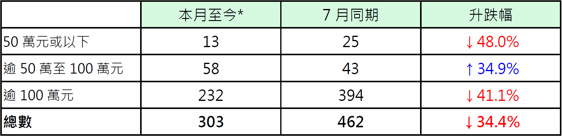 按金额划分本月至今纯车位注册量表现,其中价值50万元或以下纯车位录13宗注册,较7月同期的25宗减少48%;价值100万元以上纯车位录232宗注册,较7月同期的394宗减少约41.1%;反观,价值50万以上至100万元纯车位录58宗注册,较7月同期的43宗增加约34.9% (见表)。