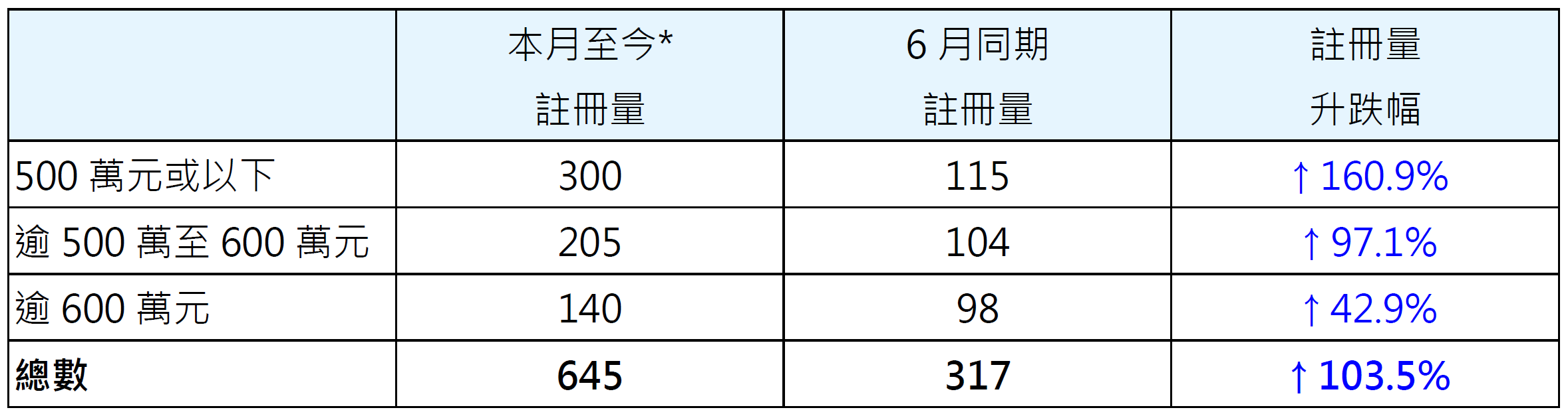 表一︰按金额划分本月至今*二手居屋注册量与6月同期比较
