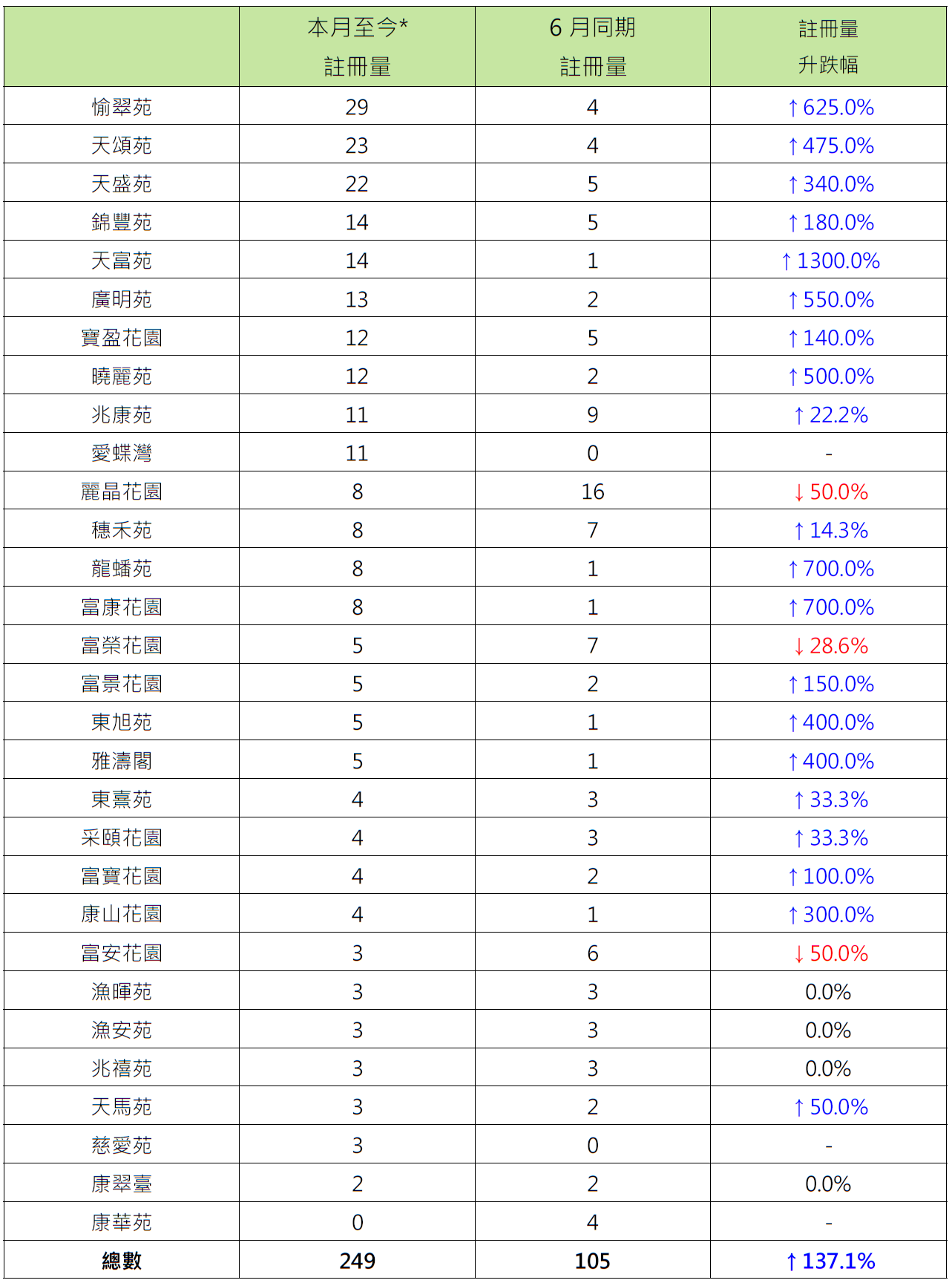 而本月至今二手居屋注册量屋苑排名方面,沙田愉翠苑暂以29宗注册居榜首,较6月同期的4宗大增625%;天水围天颂苑暂以23宗注册排第二,较6月同期的4宗大增475%;天水围天盛苑暂以22宗注册紧随其后,较6月同期的5宗大增340%(见表二)。
