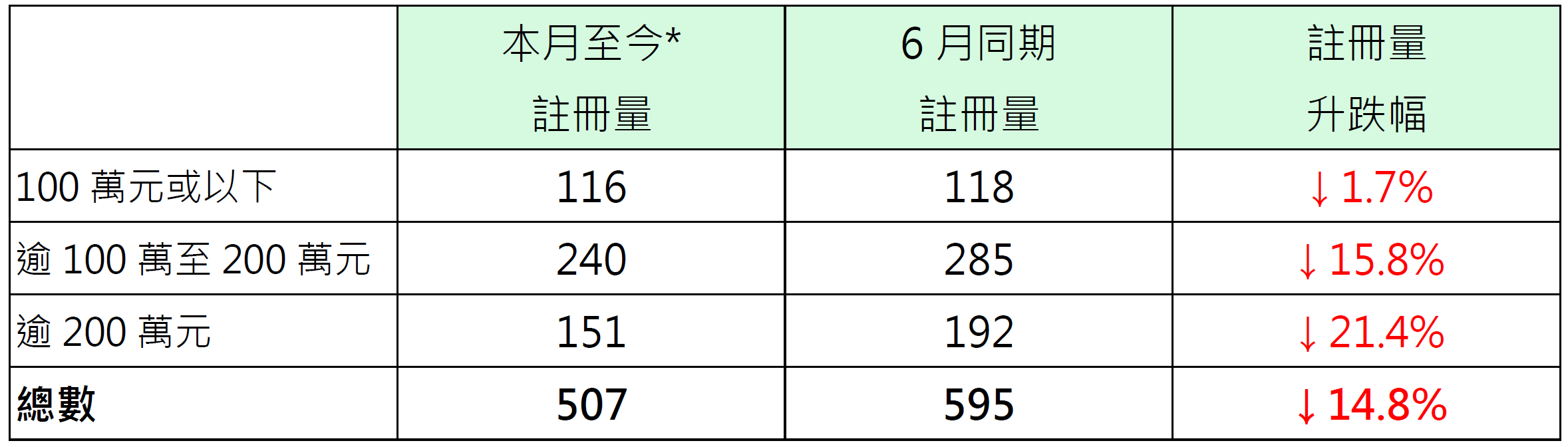 若按金额划分本月至今纯车位注册量表现,其中价值100万元或以下纯车位录116宗注册,较6月同期的118宗减少约1.7%;价值100万以上至200万元纯车位录240宗注册,较6月同期的285宗减少约15.8%;价值200万元以上纯车位录151宗注册,较6月同期的192宗减少约21.4%(见表)。