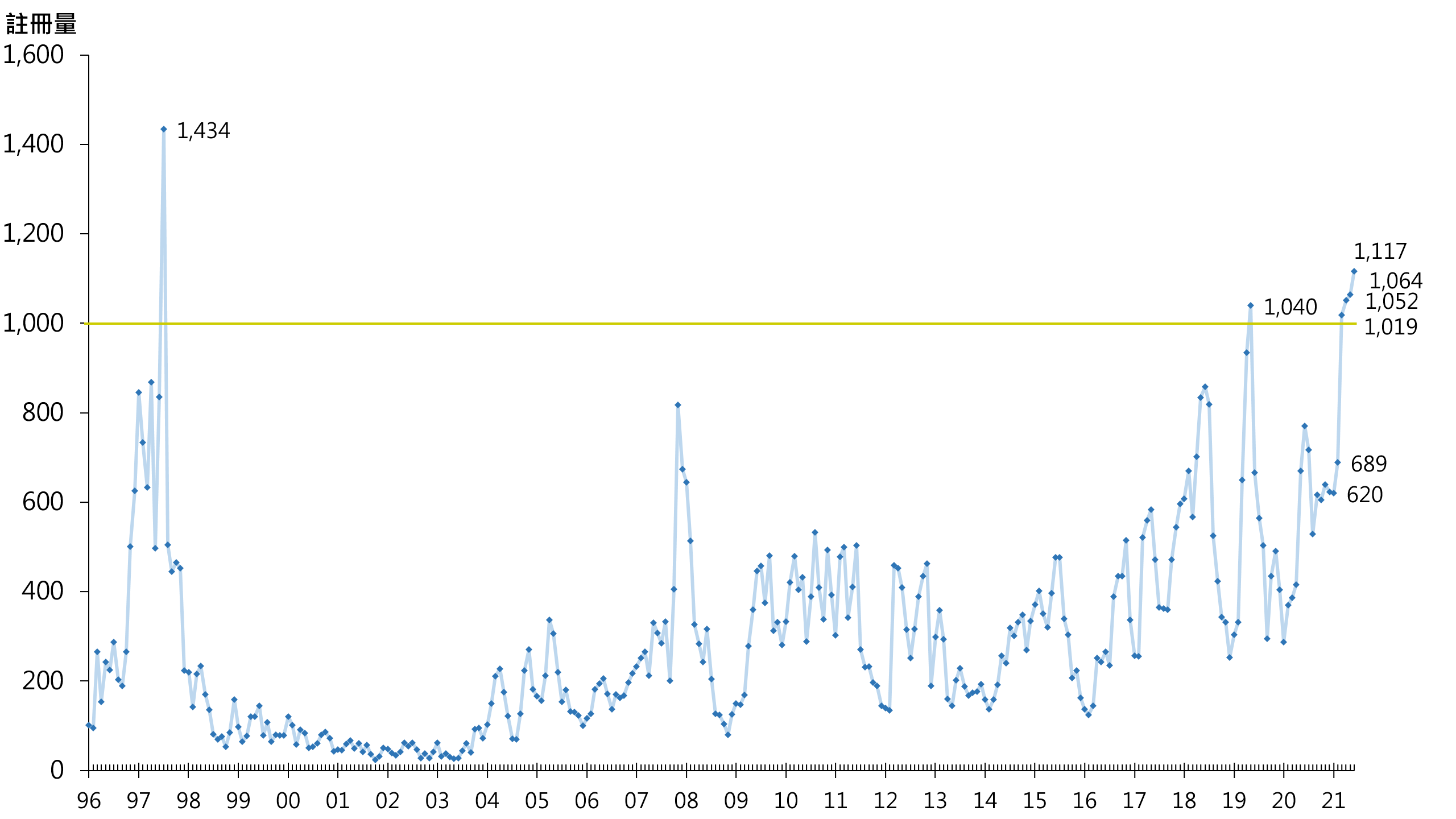 据土地注册处资料显示,逾1,000万元二手住宅6月录1,117宗注册,较5月的1,064宗增加约5%,连升5个月,更是连续4个月录逾千宗水平,情况属96年有纪录以来首见(见图)。鉴于签署买卖合约至递交到土地注册处注册登记需时,6月注册个案一般主要反映5月市况。