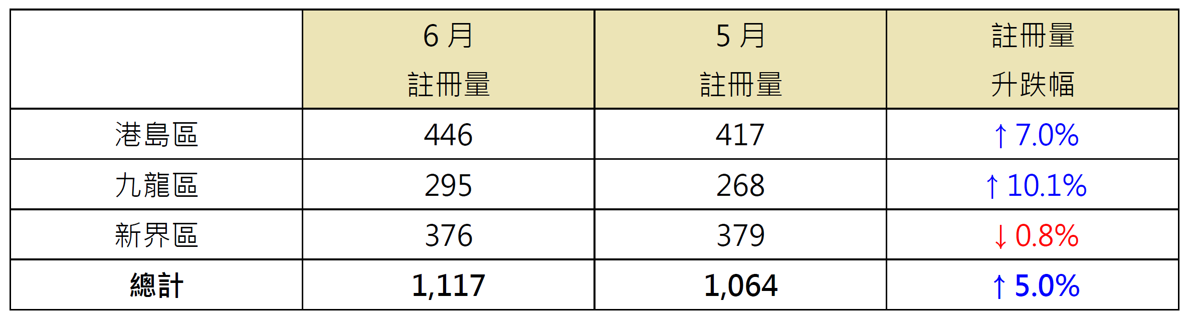若以港岛、九龙及新界三区划分6月逾1,000万元二手住宅注册量表现,其中九龙区于三区中表现最好,录295宗注册,较5月的268宗增加约10.1%;港岛区录446宗注册,较5月的417宗增加约7%;相反,新界区录376宗注册,较5月的379宗微减不足1%(见表)。
