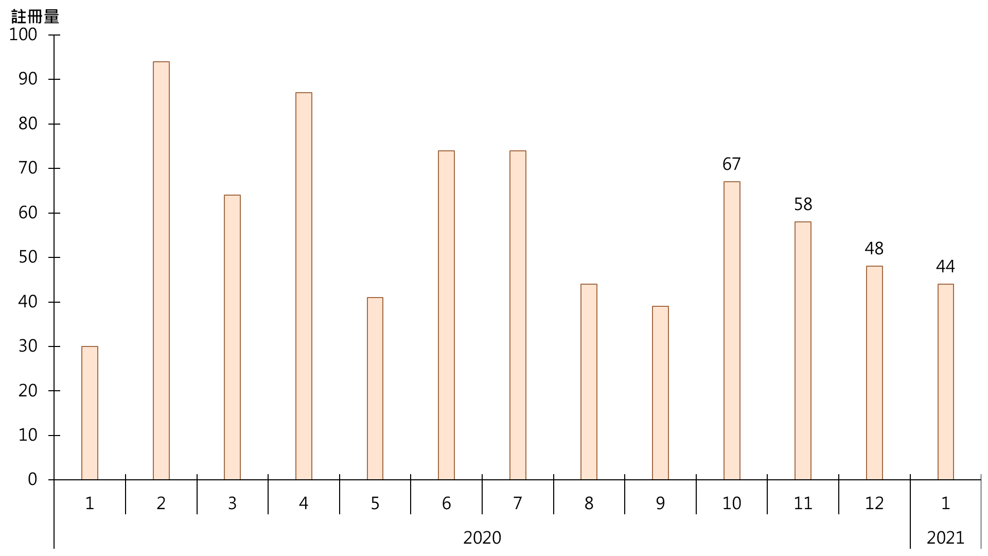 据土地注册处资料显示,1月录44宗二手公屋(包括已补地价的自由市场及未补地价的第二市场)注册,较去年12月的48宗减少约8.3%,连跌3个月(见图)。鉴于签署买卖合约至递交到土地注册处注册登记需时,今年1月注册个案一般主要反映去年12月市况。