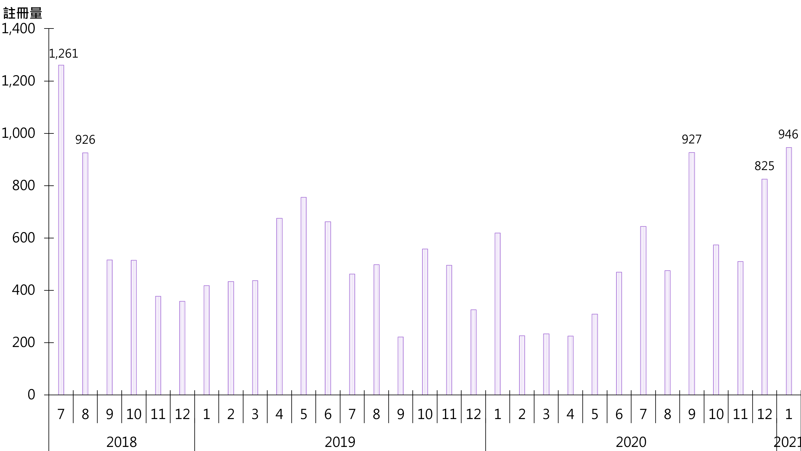 据土地注册处资料显示,1月录946宗纯车位注册,较去年12月的825宗增加约14.7%,创2年半新高(见图)。鉴于签署买卖合约至递交到土地注册处注册登记需时,1月注册个案一般主要反映去年12月市况。