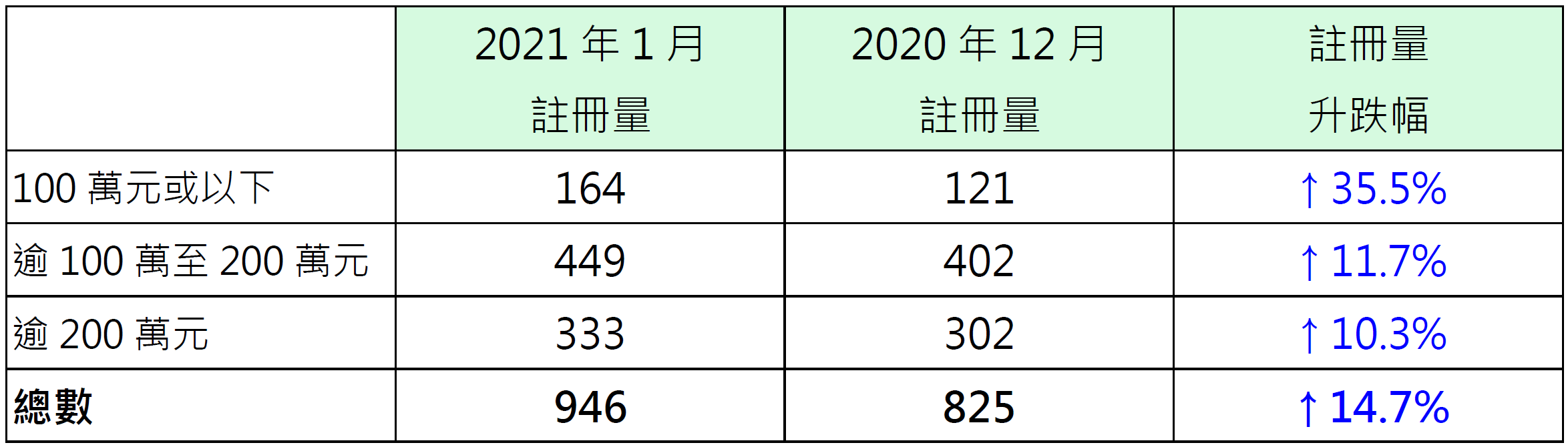 若按金额划分1月纯车位注册量表现,其中价值100万元或以下纯车位录164宗注册,较去年12月的121宗增加约35.5%;价值100万以上至200万元纯车位录449宗注册,较去年12月的402宗增加约11.7%;价值200万元以上纯车位录333宗注册,较去年12月的302宗增加约10.3%(见表)。